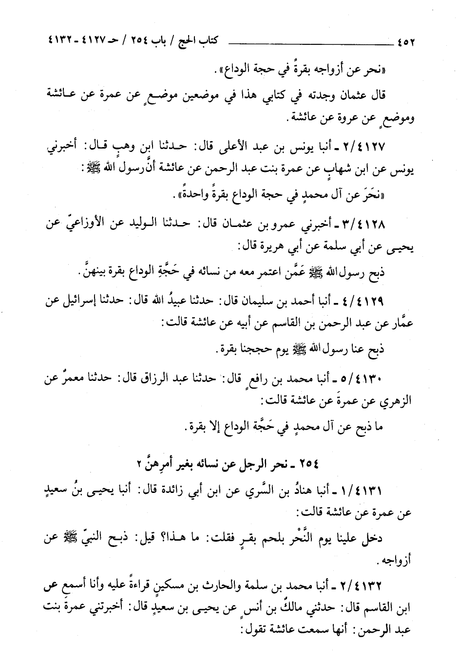 4127 - أنبأ يونس بن عبد الأعلى قال حدثنا بن وهب قال أخبرني يونس عن بن شهاب عن عمرة بنت عبد الرحمن عن عائشة : أن رسول الله صلى الله عليه و سلم نحر عن آل محمد في حجة الوداع بقرة واحدة