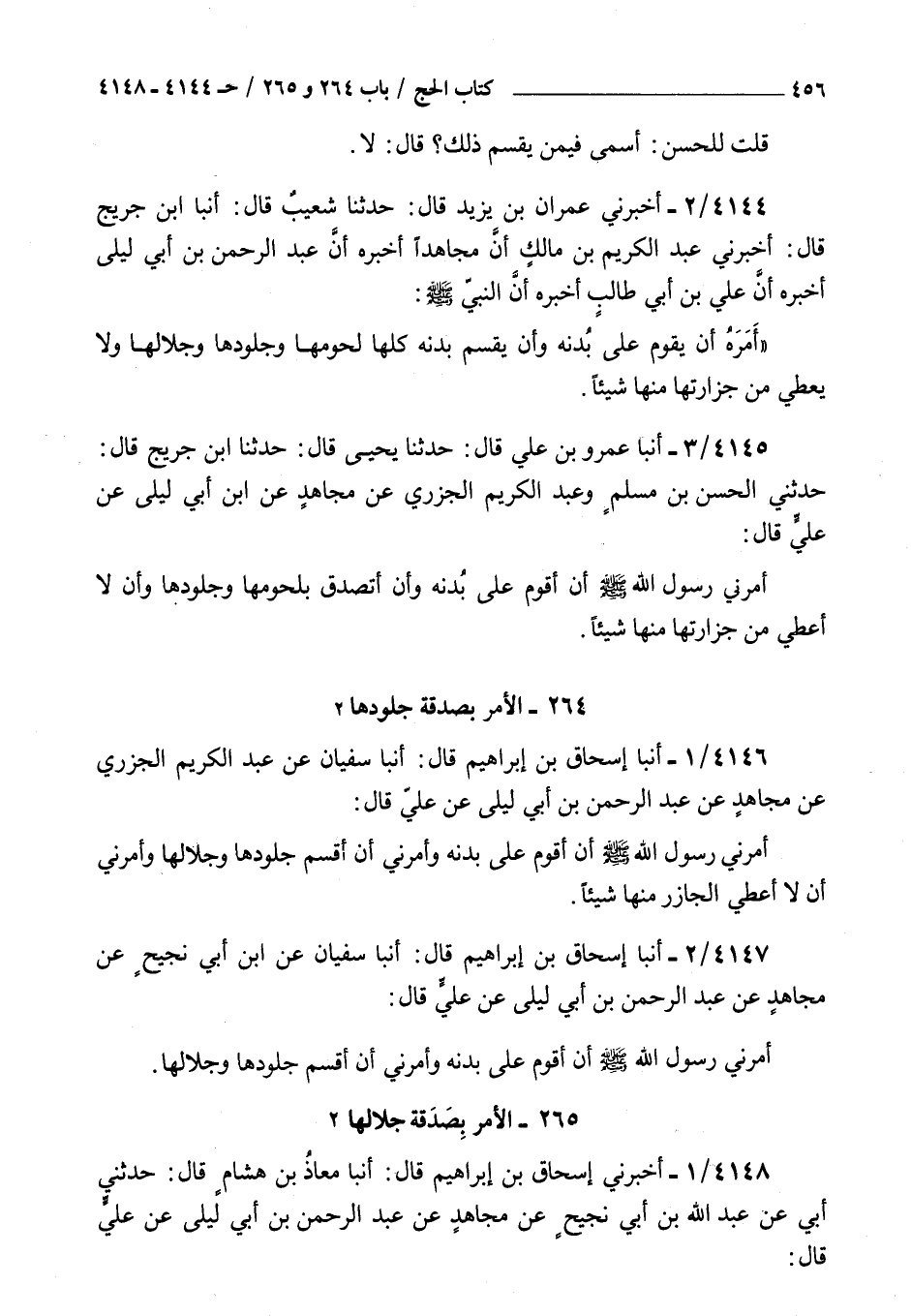 4148 - أخبرني إسحاق بن إبراهيم قال أنبأ معاذ بن هشام قال حدثني أبي عن عبد الله بن أبي نجيح عن مجاهد عن عبد الرحمن بن أبي ليلى عن علي قال : أمرني رسول الله صلى الله عليه و سلم أن أقسم البدن ثم قال أقسمت فقلت نعم قال أقسم أجلتها وجلودها