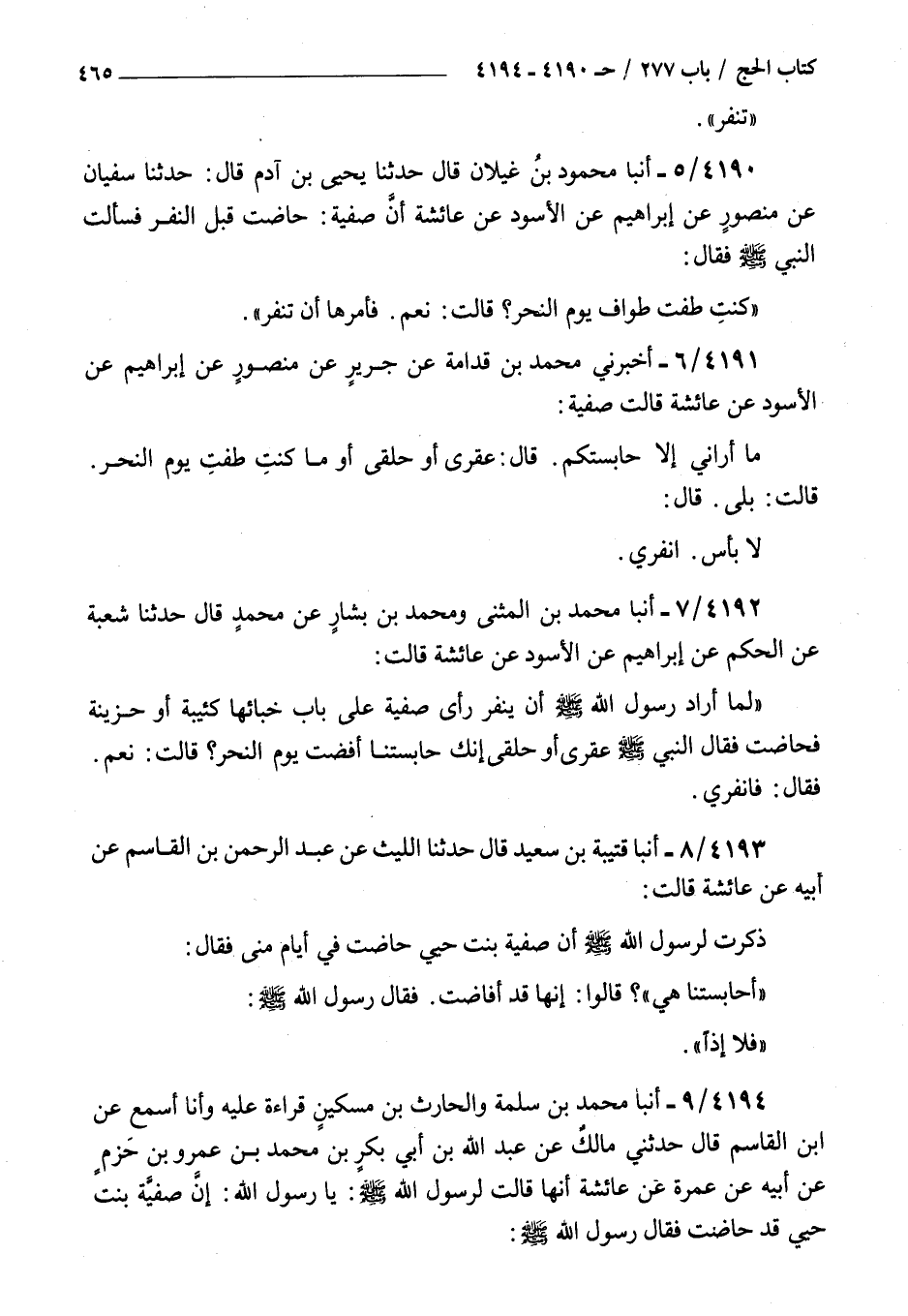 4193 - أنبأ قتيبة بن سعيد قال حدثنا الليث عن عبد الرحمن بن القاسم عن أبيه عن عائشة قالت : ذكرت لرسول الله صلى الله عليه و سلم أن صفية بنت حيي حاضت في أيام منى فقال أحابستنا هي قالوا إنها قد أفاضت فقال رسول الله صلى الله عليه و سلم فلا إذا