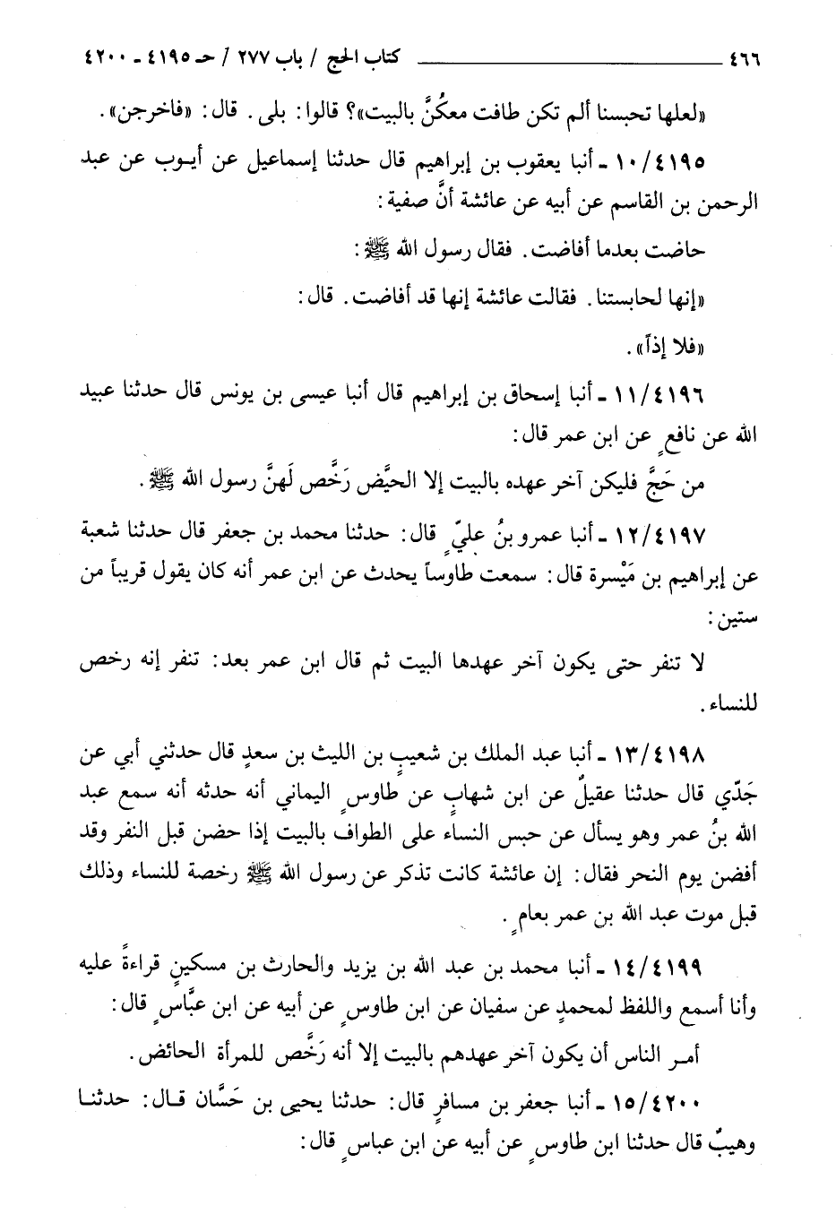 4195 - أنبأ يعقوب بن إبراهيم قال حدثنا إسماعيل عن أيوب عن عبد الرحمن بن القاسم عن أبيه عن عائشة : أن صفية حاضت بعدما أفاضت فقال رسول الله صلى الله عليه و سلم إنها لحابستنا فقالت عائشة إنها قد أفاضت قال فلا إذا