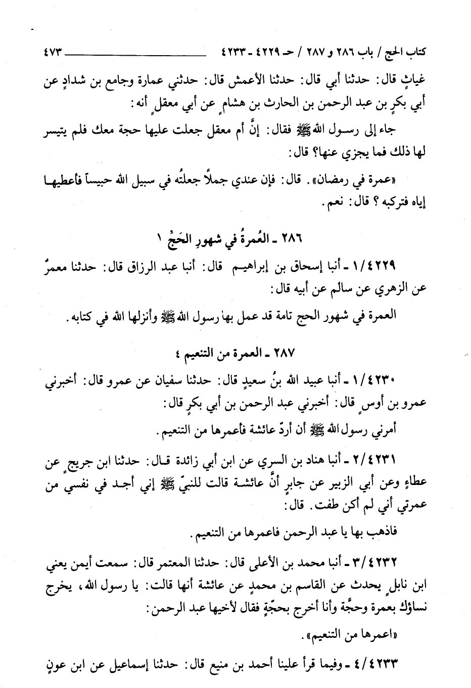 4230 - أنبأ عبيد الله بن سعيد قال حدثنا سفيان عن عمرو قال أخبرني عمرو بن أوس قال أخبرني عبد الرحمن بن أبي بكر قال : أمرني رسول الله صلى الله عليه و سلم أن أرد عائشة فأعمرها من التنعيم