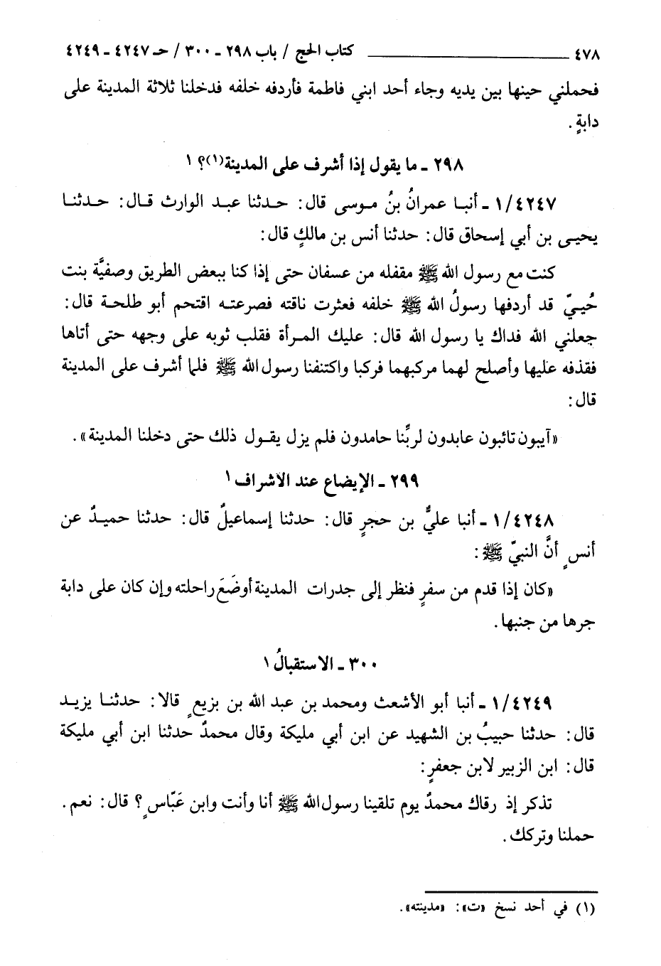 4247 - أنبأ عمران بن موسى قال حدثنا عبد الوارث قال حدثنا يحيى بن أبي إسحاق قال حدثنا أنس بن مالك قال : كنت مع رسول الله صلى الله عليه و سلم مقفلة من عسفان حتى إذا كنا ببعض الطريق وصفية بنت حيي قد أردفها رسول الله صلى الله عليه و سلم خلفه فعثرت ناقته فصرعته اقتحم أبو طلحة قال جعلني الله فداك يا رسول الله قال عليك المرأة فقلب ثوبه على وجهه حتى أتاها فقذفه عليها وأصلح لهما مركبهما فركبا واكتنفنا رسول الله صلى الله عليه و سلم فلما أشرف على المدينة قال آيبون تائبون عابدون لربنا حامدون فلم يزل يقول ذلك حتى دخلنا المدينة