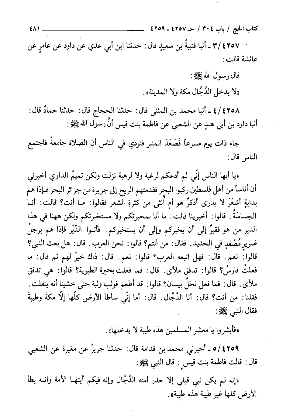 4258 - أنبأ محمد بن المثنى قال حدثنا الحجاج قال حدثنا حماد قال أنبأ داود بن أبي هند عن الشعبي عن فاطمة بنت قيس : أن رسول الله صلى الله عليه و سلم جاء ذات يوم مسرعا فصعد المنبر فنودي في الناس أن الصلاة جامعة فاجتمع الناس قال يا أيها الناس إني لم أدعكم لرغبة ولا لرهبة نزلت ولكن تميم الداري أخبرني أن أناسا من أهل فلسطين ركبوا البحر فقدمتهم الريح إلى جزيرة من جزائر البحر فإذا هم بدابة أشعر لا يدرى أذكر هو أم أنثى من كثرة الشعر فقالوا ما أنت قالت أنا الجساسة قالوا أخبرينا قالت ما أنا بمخبرتكم ولا مستخبرتكم ولكن ههنا في هذا الدير من هو فقير إلى أن يخبركم وإلى أن يستخبركم فأتوا الدير فإذا هم برجل ضرير مصفد في الحديد فقال من أنتم قالوا نحن العرب قال هل بعث النبي قالوا نعم قال فهل اتبعه العرب قالوا نعم قال ذاك خير لهم ثم قال ما فعلت فارس قالوا تدفق ملأى قال فما فعلت بحيرة الطبرية قالوا هي تدفق ملأى قال فما فعل نخل بيسان قالوا قد أطعم فوثب وثبة حتى خشينا أنه ينفلت فقلنا من أنت قال أنا الدجال قال أما إني سأطأ الأرض كلها إلا مكة وطيبة فقال النبي صلى الله عليه و سلم فأبشروا يا معشر المسلمين هذه طيبة لا يدخلها
