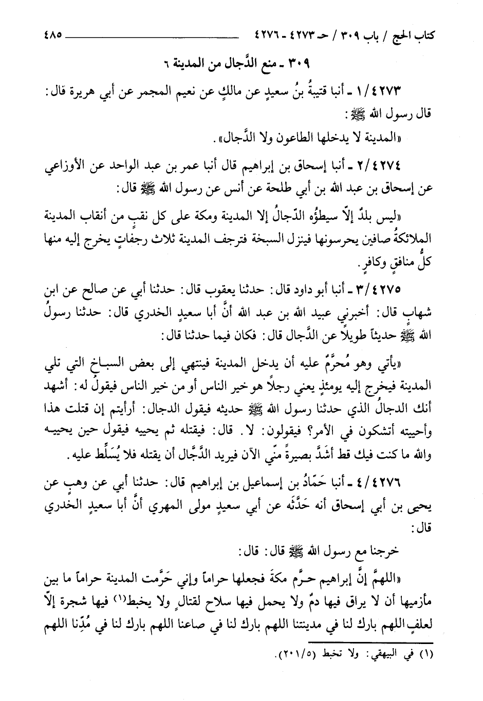 4273 - أنبأ قتيبة بن سعيد عن مالك عن نعيم المجمر عن أبي هريرة قال قال رسول الله صلى الله عليه و سلم : المدينة لا يدخلها الطاعون ولا الدجال