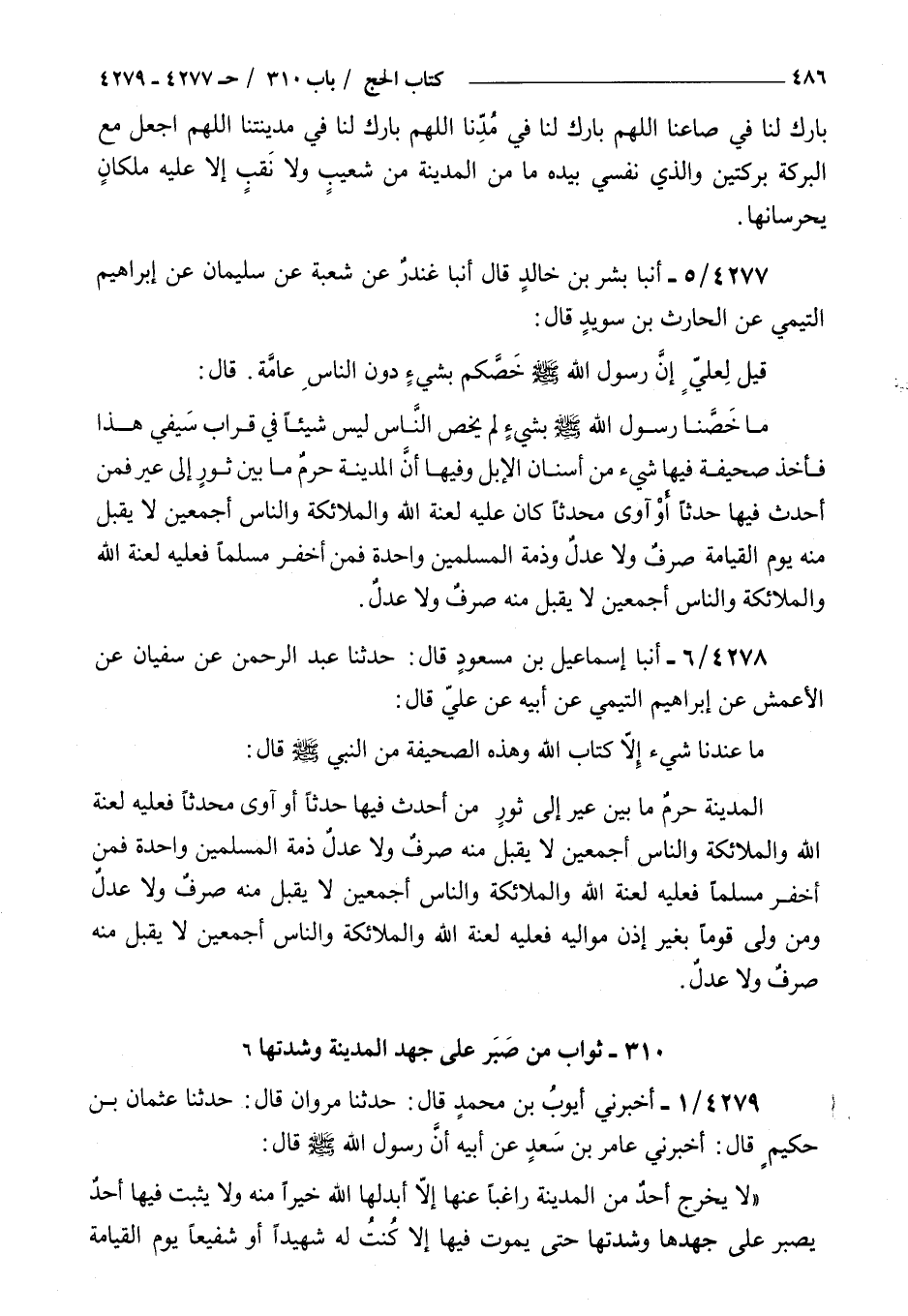 4277 - أنبأ بشر بن خالد قال أنبأ غندر عن شعبة عن سليمان عن إبراهيم التيمي عن الحارث بن سويد قال قيل لعلي : إن رسول الله صلى الله عليه و سلم خصكم بشيء دون الناس عامة قال ما خصنا رسول الله صلى الله عليه و سلم بشيء لم يخص الناس ليس شيئا في قراب سيفي هذا فأخذ صحيفة فيها شيء من أسنان الإبل وفيها أن المدينة حرم ما بين ثور إلى عير فمن أحدث فيها حدثا أو آوى محدثا كان عليه لعنة الله والملائكة والناس أجمعين لا يقبل منه يوم القيامة صرف ولا عدل وذمة المسلمين واحدة فمن أخفر مسلما فعليه لعنة الله والملائكة والناس أجمعين لا يقبل منه صرف ولا عدل