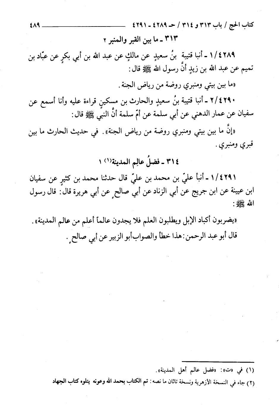 4291 - أنبأ علي بن محمد بن علي قال حدثنا محمد بن كثير عن سفيان بن عيينة عن بن جريج عن أبي الزناد عن أبي صالح عن أبي هريرة قال قال رسول الله صلى الله عليه و سلم : يضربون أكباد الإبل ويطلبون العلم فلا يجدون عالما أعلم من عالم المدينة قال أبو عبد الرحمن هذا خطأ والصواب أبو الزبير عن أبي صالح [ ص 3 ] بسم الله الرحمن الرحيم