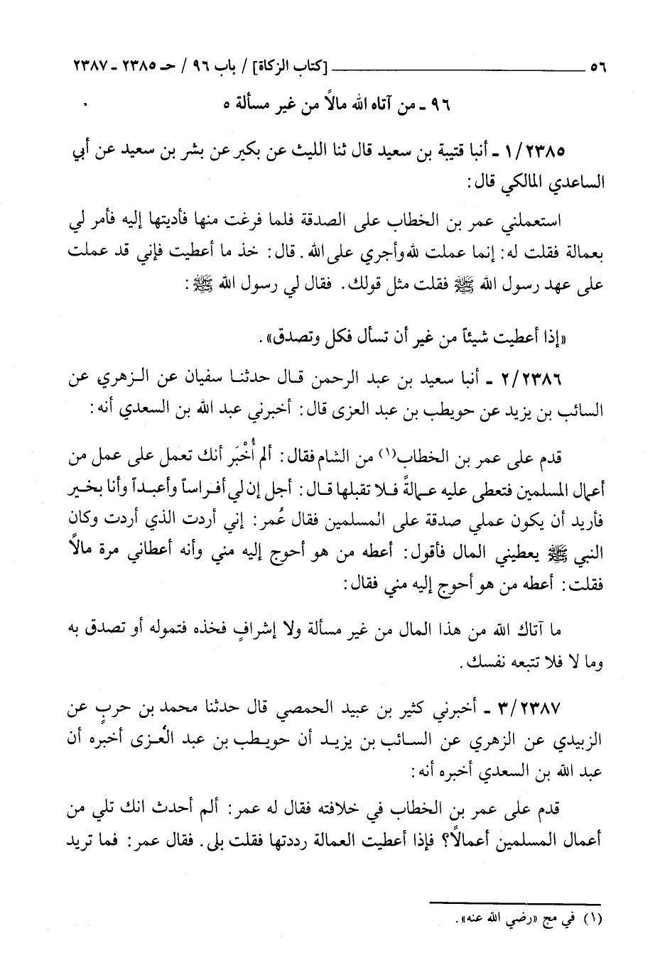 2387 - أخبرني كثير بن عبيد الحمصي قال حدثنا محمد بن حرب عن الزبيدي عن الزهري عن السائب بن يزيد أن حويطب بن عبد العزى أخبره أن عبد الله بن السعدي أخبره أنه قدم على عمر بن الخطاب في خلافته فقال له عمر : ألم أحدث أنك تلي من أعمال المسلمين أعمالا فإذا أعطيت العمالة رددتها فقلت بلى فقال عمر فما تريد إلى ذلك قلت لي أفراس وأعبد وأنا بخير وأريد أن يكون عملي صدقة على المسلمين فقال له عمر فلا تفعل فإني كنت أردت مثل الذي أردت كان رسول الله صلى الله عليه و سلم يعطيني العطاء فأقول له أعطه أفقر إليه مني فقال رسول الله صلى الله عليه و سلم خذه تموله أو تصدق به ما جاءك من هذا المال وأنت غير مشرف ولا سائل فخذه وما لا فلا تتبعه نفسك