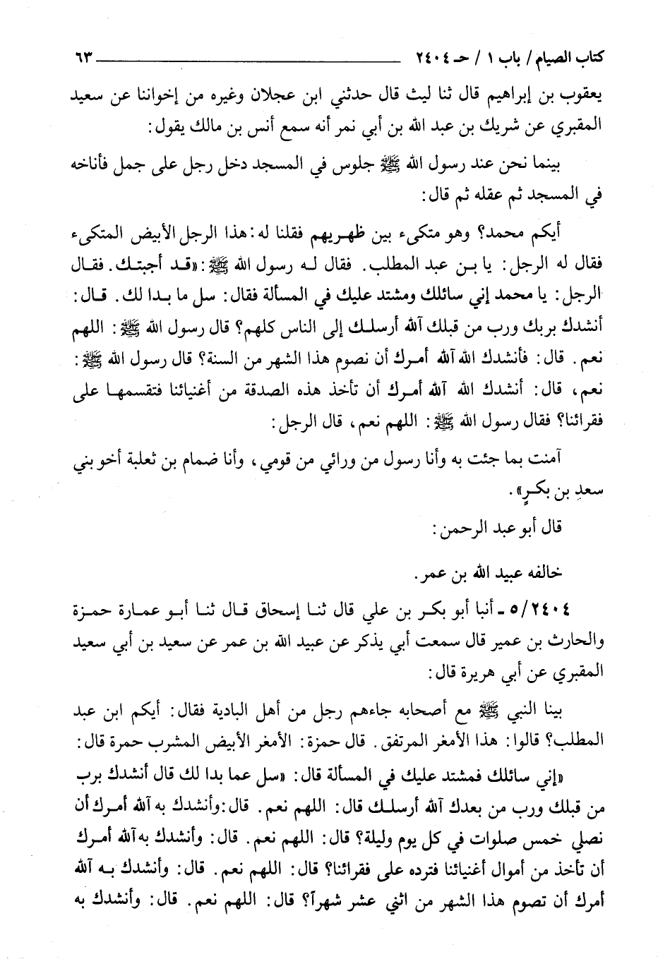 2404 - أنبأ أبو بكر بن علي قال ثنا إسحاق قال ثنا أبو عمارة حمزة والحارث بن عمير قال سمعت أبي يذكر عن عبيد الله بن عمر عن سعيد بن أبي سعيد المقبري عن أبي هريرة قال : بينا النبي صلى الله عليه و سلم مع أصحابه جاءهم رجل من أهل البادية فقال أيكم بن عبد المطلب قالوا هذا الأمغر المرتفق قال حمزة الأمغر الأبيض المشرب حمرة قال إني سائلك فمشتد عليك في المسألة قال سل عما بدا لك قال أنشدك برب من قبلك ورب من بعدك آلله أرسلك قال اللهم نعم قال وأنشدك به آلله أمرك أن نصلي خمس صلوات في كل يوم وليلة قال اللهم نعم قال وأنشدك به آلله أمرك أن تأخذ من أموال الأغنياء فترده على فقرائنا قال اللهم نعم قال وأنشدك به آلله أمرك أن تصوم هذا الشهر من اثني عشر شهرا قال اللهم نعم قال وأنشدك به آلله أمرك أن نحج هذا البيت من استطاع إليه سبيلا قال اللهم نعم قال فإني آمنت وصدقت وأنا ضمام بن ثعلبة