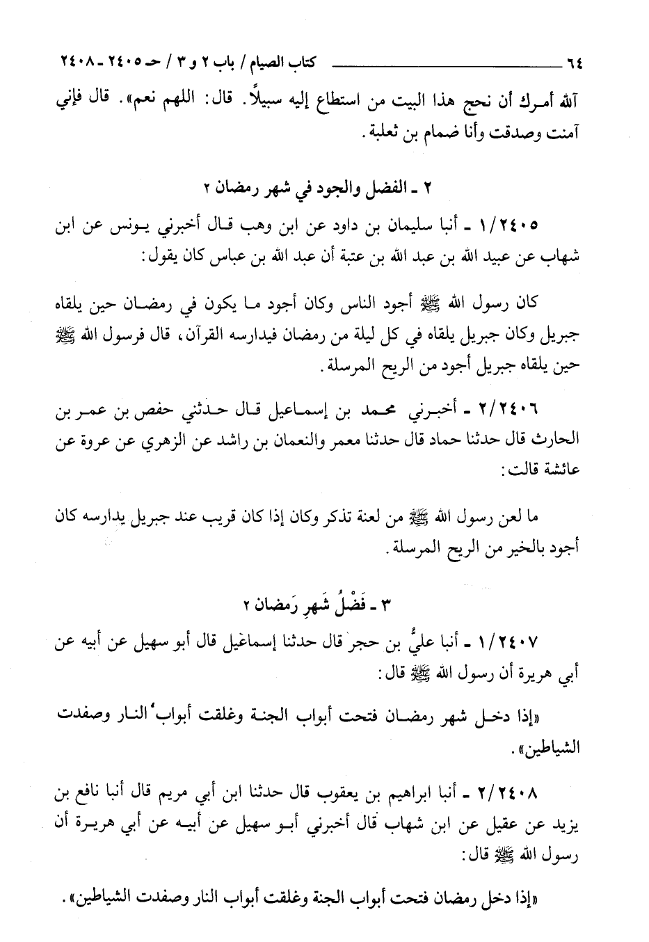 2405 - أنبأ سليمان بن داود عن بن وهب قال أخبرني يونس عن بن شهاب عن عبيد الله بن عبد الله بن عتبة أن عبد الله بن عباس كان يقول : كان رسول الله صلى الله عليه و سلم أجود الناس وكان أجود ما يكون في رمضان حين يلقاه جبريل وكان جبريل يلقاه في كل ليلة من رمضان فيدارسه القرآن قال فرسول الله صلى الله عليه و سلم حين يلقاه جبريل أجود من الريح المرسلة