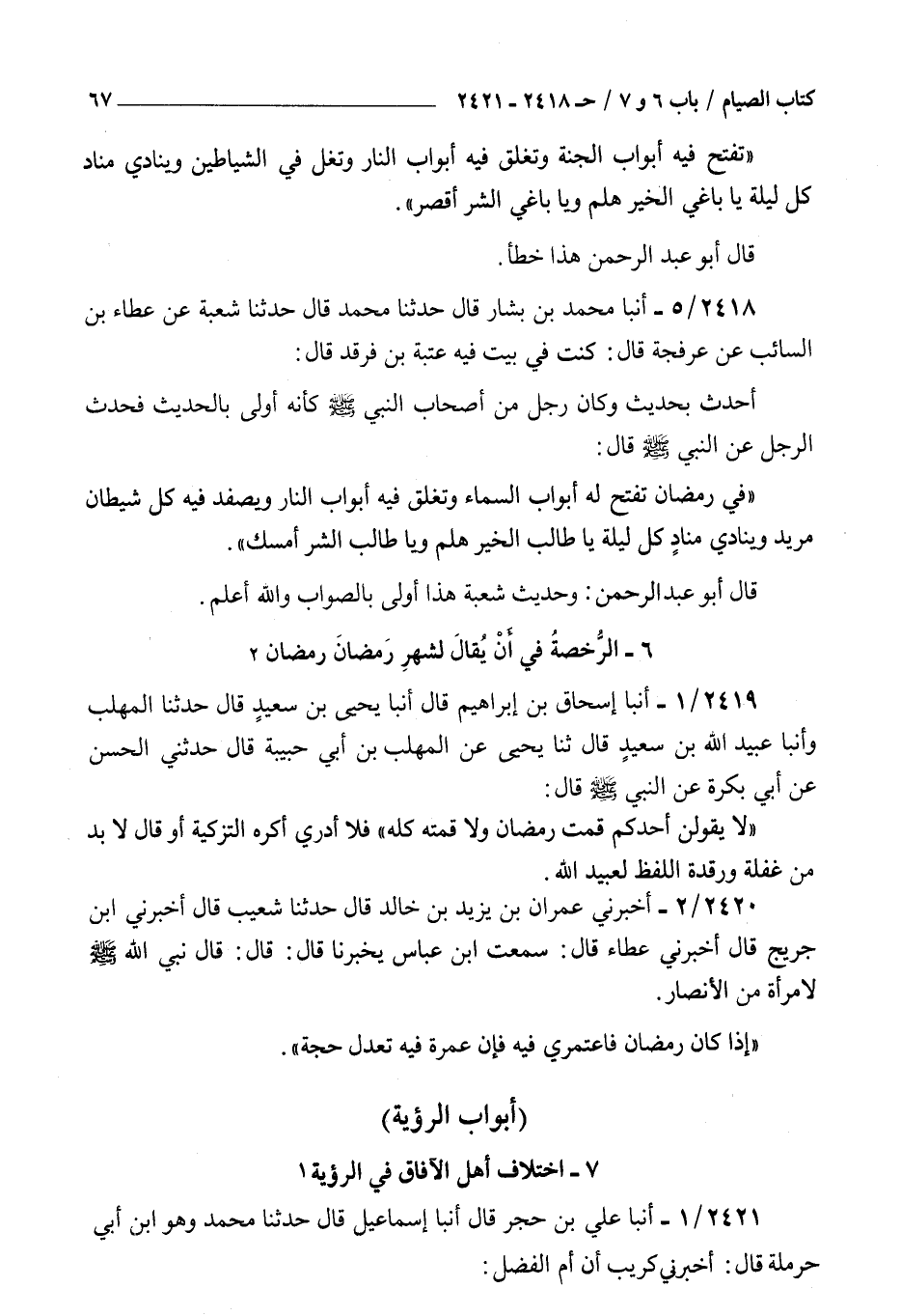 2418 - أنبأ محمد بن بشار قال حدثنا محمد قال حدثنا شعبة عن عطاء بن السائب عن عرفجة قال كنت في بيت فيه عتبة بن فرقد قال أحدث بحديث وكان رجل من أصحاب النبي صلى الله عليه و سلم كأنه أولى بالحديث فحدث الرجل عن النبي صلى الله عليه و سلم قال: في رمضان تفتح له أبواب السماء وتغلق فيه أبواب النار ويصفد فيه كل شيطان مريد وينادي مناد كل ليلة يا طالب الخير هلم ويا طالب الشر أمسك قال أبو عبد الرحمن وحديث شعبة هذا أولى بالصواب والله أعلم