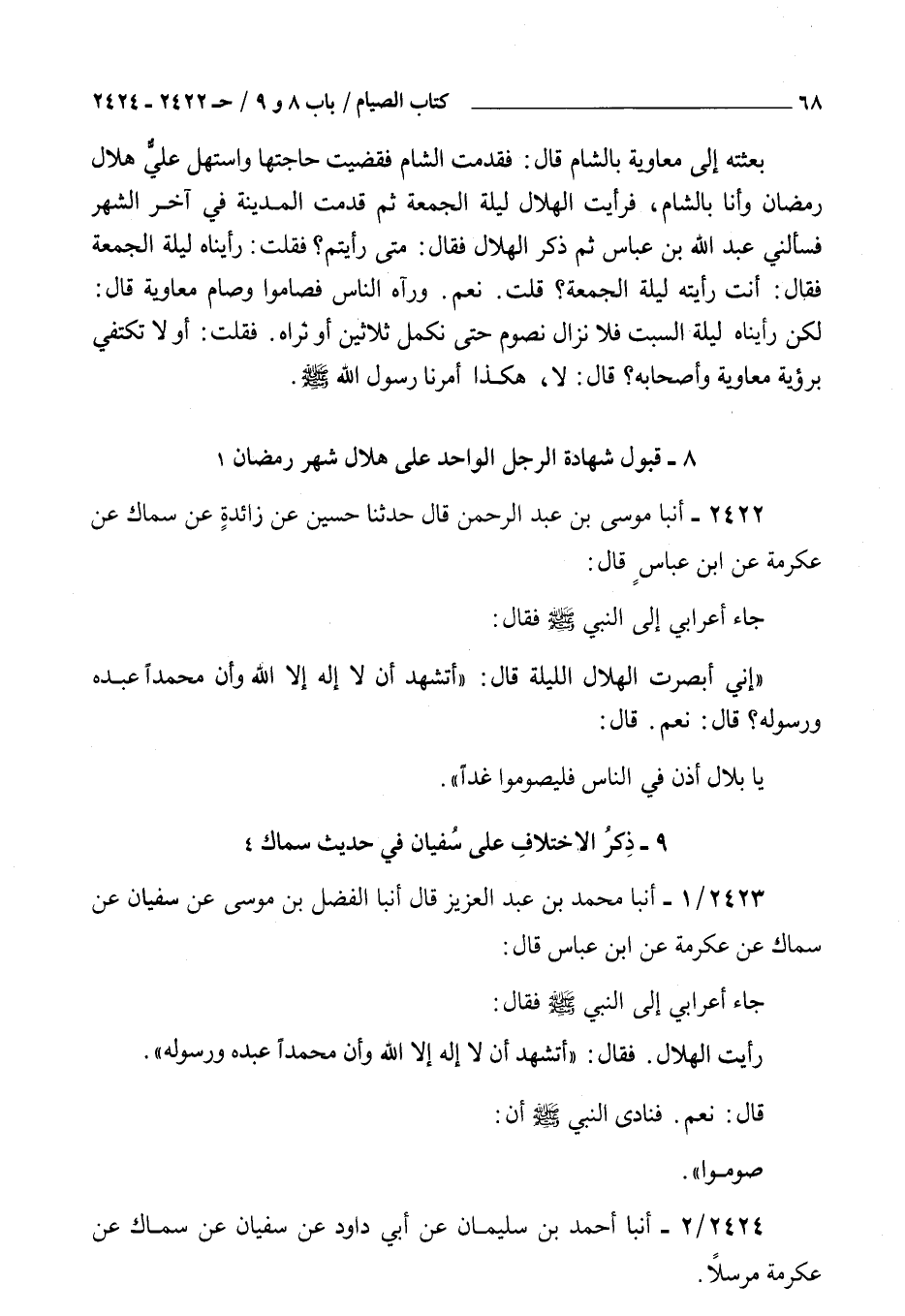2422 - أنبأ موسى بن عبد الرحمن قال حدثنا حسين عن زائدة عن سماك عن عكرمة عن بن عباس قال : جاء أعرابي إلى النبي صلى الله عليه و سلم فقال إني أبصرت الهلال الليلة قال أتشهد أن لا إله إلا الله وأن محمدا عبده ورسوله قلت نعم قال يا بلال أذن في الناس فليصوموا غدا
