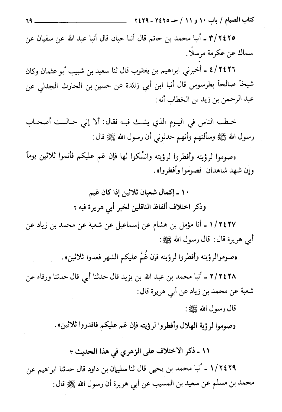 2426 - أخبرني إبراهيم بن يعقوب قال ثنا سعيد بن شبيب أبو عثمان وكان شيخا صالحا بطرسوس قال أنبأ بن أبي زائدة عن حسين بن الحارث الجدلي عن عبد الرحمن بن زيد بن الخطاب أنه خطب الناس في اليوم الذي يشك فيه فقال ألا إني جالست أصحاب رسول الله صلى الله عليه و سلم وسألتهم وأنهم حدثوني أن رسول الله صلى الله عليه و سلم قال : صوموا لرؤيته وأفطروا لرؤيته وانسكوا لها فإن غم عليكم فأتموا ثلاثين يوما وإن شهد شاهدان فصوموا وأفطروا