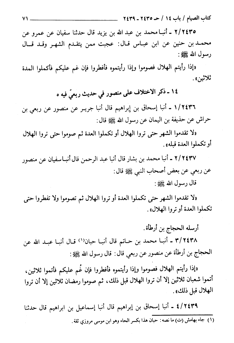 2436 - أنبأ إسحاق بن إبراهيم قال أنبأ جرير عن منصور عن ربعي بن حراش عن حذيفة بن اليمان عن رسول الله صلى الله عليه و سلم قال : لا تقدموا الشهر حتى تروا الهلال أو تكملوا العدة ثم صوموا حتى تروا الهلال أو تكملوا العدة قبله
