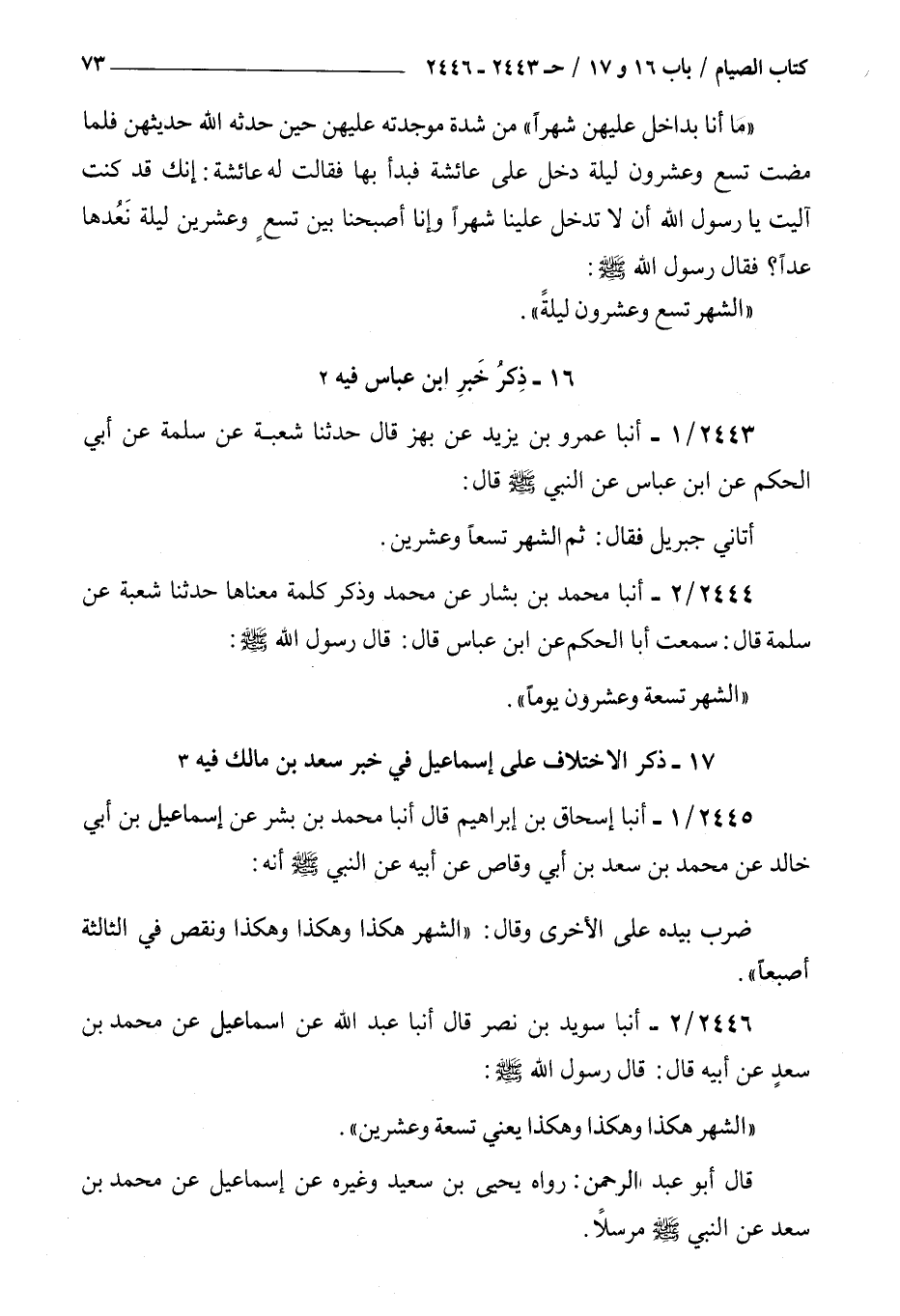 2446 - أنبأ سويد بن نصر قال أنبأ عبد الله عن إسماعيل عن محمد بن سعد عن أبيه قال قال رسول الله صلى الله عليه و سلم : الشهر هكذا وهكذا وهكذا يعني تسعة وعشرين قال أبو عبد الرحمن رواه يحيى بن سعيد وغيره عن إسماعيل عن محمد بن سعد عن النبي صلى الله عليه و سلم مرسلا