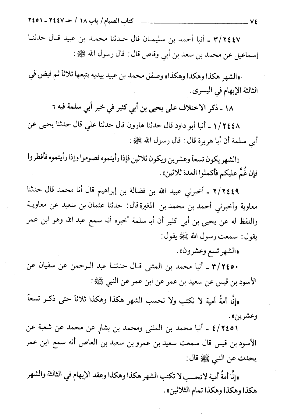 2450 - أنبأ محمد بن المثنى قال حدثنا عبد الرحمن عن سفيان عن الأسود بن قيس عن سعيد بن عمر عن بن عمر عن النبي صلى الله عليه و سلم : إنا أمة لا نكتب ولا نحسب الشهر هكذا وهكذا ثلاثا حتى ذكر تسعا وعشرين
