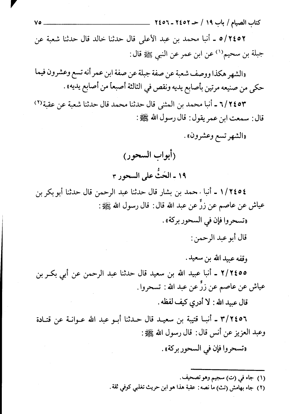 2455 - أنبأ عبيد الله بن سعيد قال حدثنا عبد الرحمن عن أبي بكر بن عياش عن عاصم عن زر عن عبد الله : تسحروا قال عبيد الله لا أدري كيف لفظه