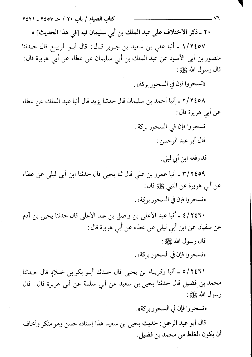 2458 - أنبأ أحمد بن سليمان قال حدثنا يزيد قال أنبأ عبد الملك عن عطاء عن أبي هريرة قال : تسحروا فإن في السحور بركة قال أبو عبد الرحمن قد رفعه بن أبي ليلى