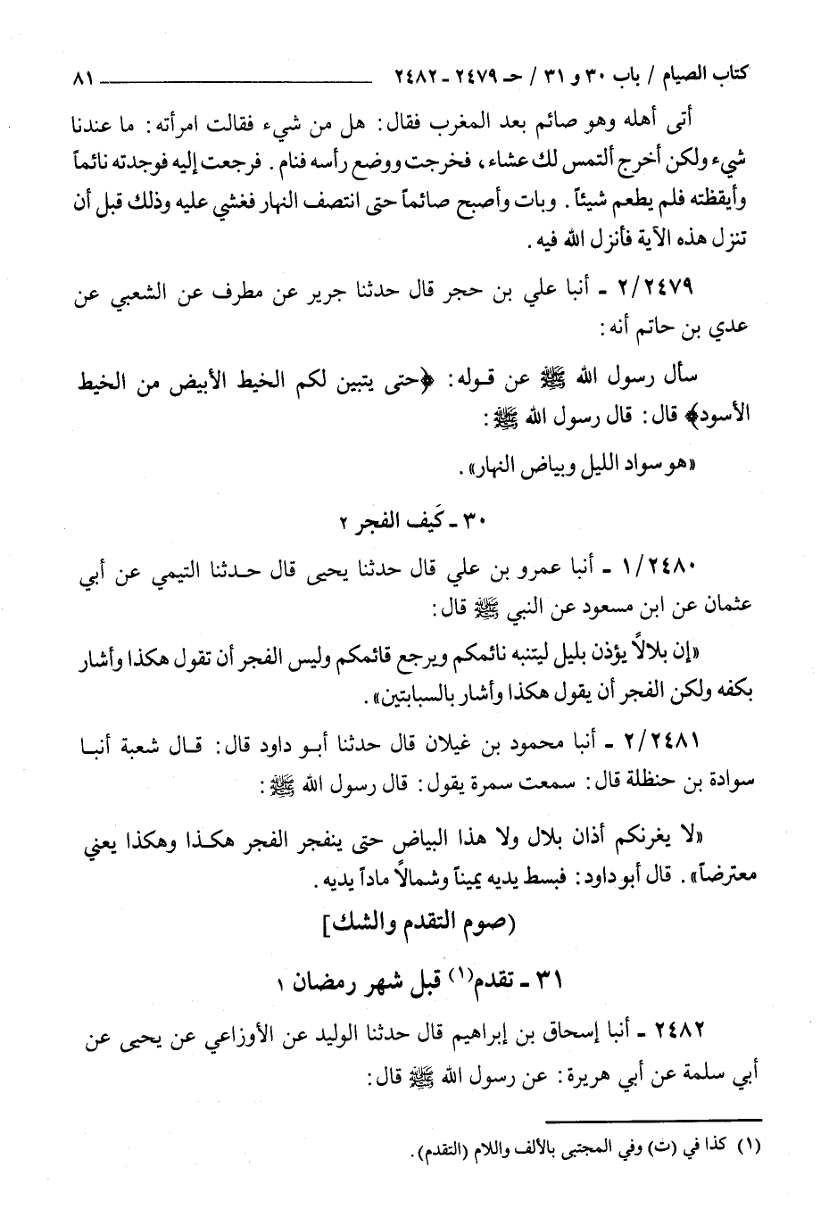 2479 - أنبأ علي بن حجر قال حدثنا جرير عن مطرف عن الشعبي عن عدي بن حاتم : أنه سأل رسول الله صلى الله عليه و سلم عن قوله { حتى يتبين لكم الخيط الأبيض من الخيط الأسود } قال قال رسول الله صلى الله عليه و سلم هو سواد الليل وبياض النهار