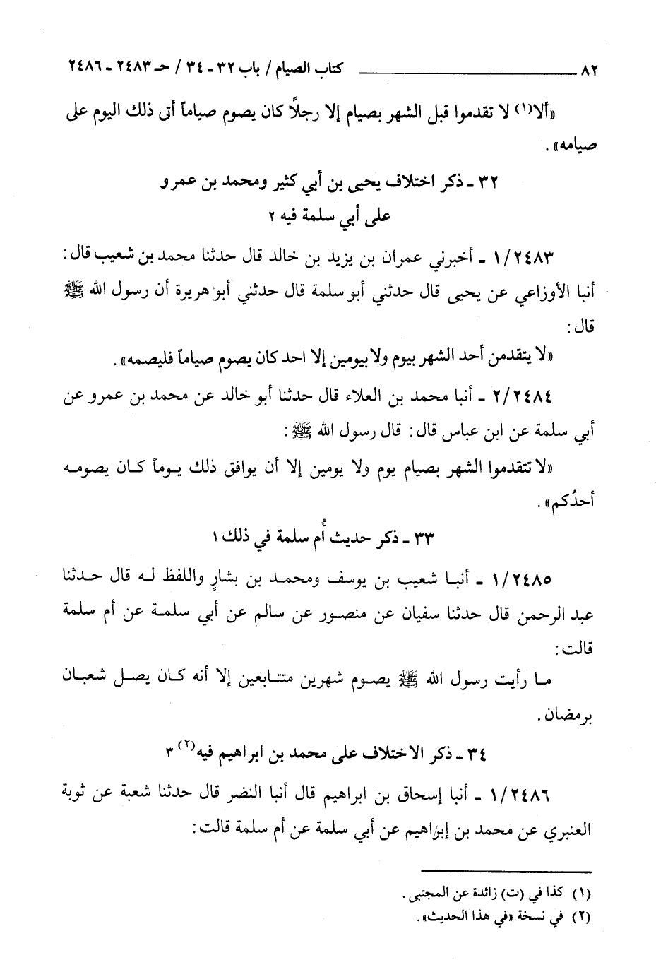 2484 - أنبأ محمد بن العلاء قال حدثنا أبو خالد عن محمد بن عمرو عن أبي سلمة عن بن عباس قال قال رسول الله صلى الله عليه و سلم : لا تتقدموا الشهر بصيام يوم ولا يومين إلا أن يوافق ذلك يوما كان يصومه أحدكم