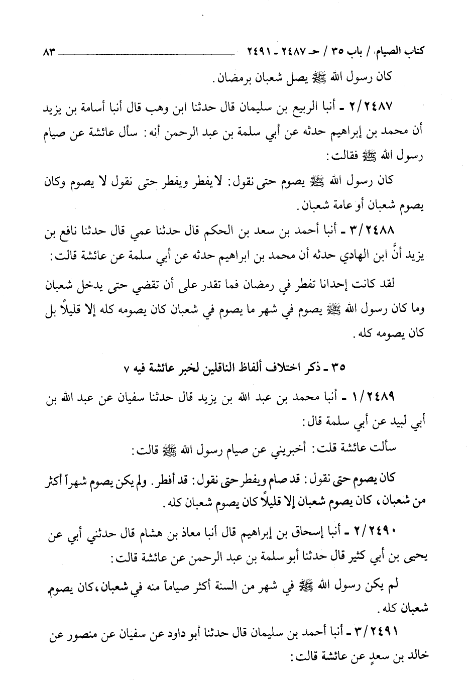 2490 - أنبأ إسحاق بن إبراهيم قال أنبأ معاذ بن هشام قال حدثني أبي عن يحيى بن أبي كثير قال حدثنا أبو سلمة بن عبد الرحمن عن عائشة قالت : لم يكن رسول الله صلى الله عليه و سلم في شهر من السنة أكثر صياما منه في شعبان كان يصوم شعبان كله