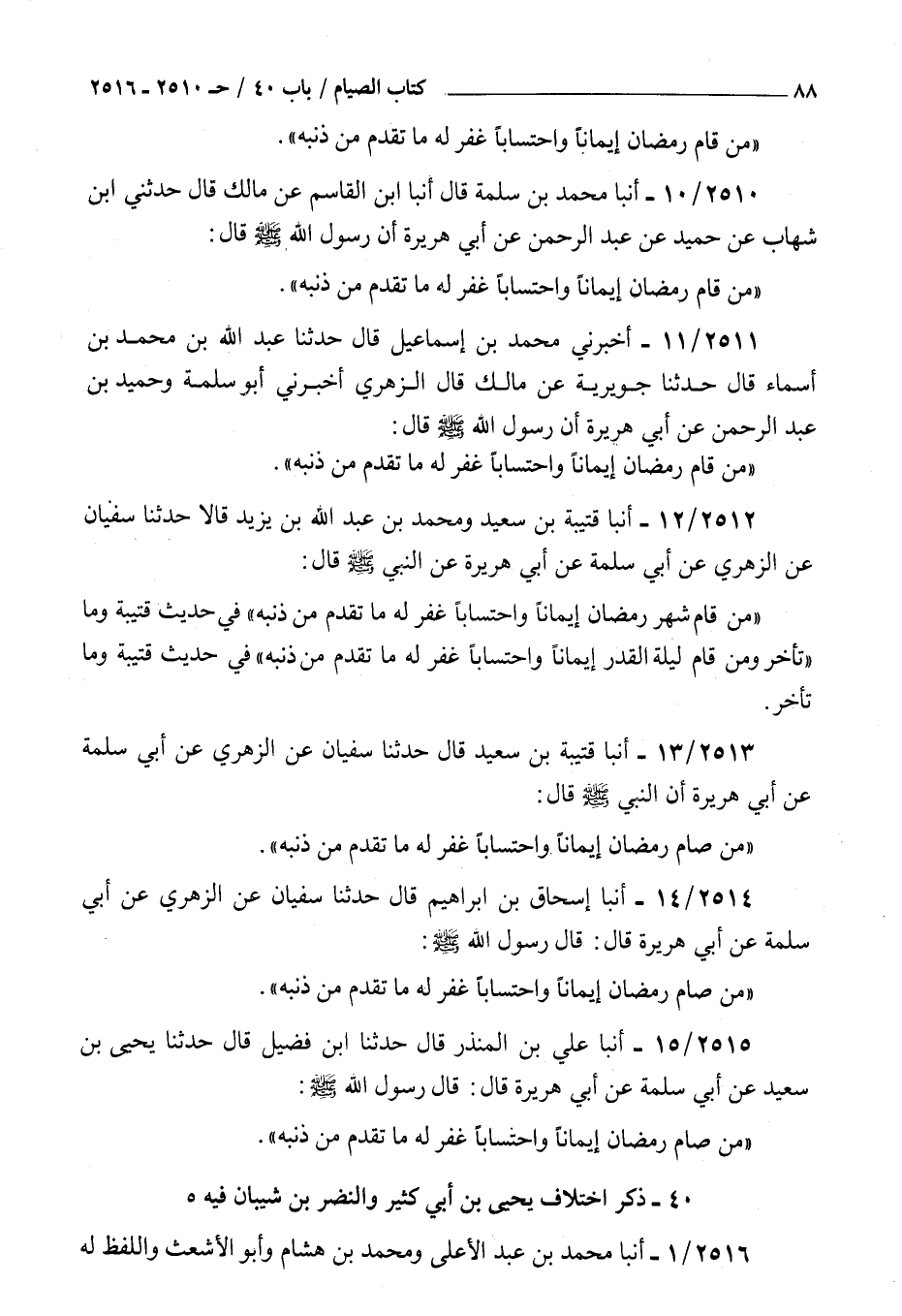 2513 - أنبأ قتيبة بن سعيد قال حدثنا سفيان عن الزهري عن أبي سلمة عن أبي هريرة أن النبي صلى الله عليه و سلم قال : من صام رمضان إيمانا واحتسابا غفر له ما تقدم من ذنبه