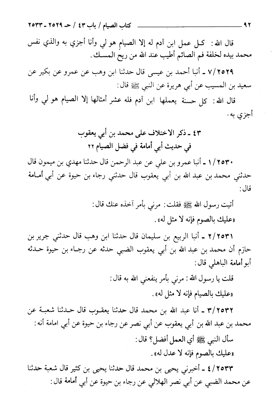 2533 - أخبرني يحيى بن محمد قال حدثنا يحيى بن كثير قال شعبة حدثنا عن محمد الضبي عن أبي نصر الهلالي عن رجاء بن حيوة عن أبي أمامة قال قلت : يا رسول الله مرني بعمل قال عليك بالصوم فإنه لا عدل له قال قلت يا رسول الله مرني بعمل قال عليك بالصوم فإنه لا عدل له