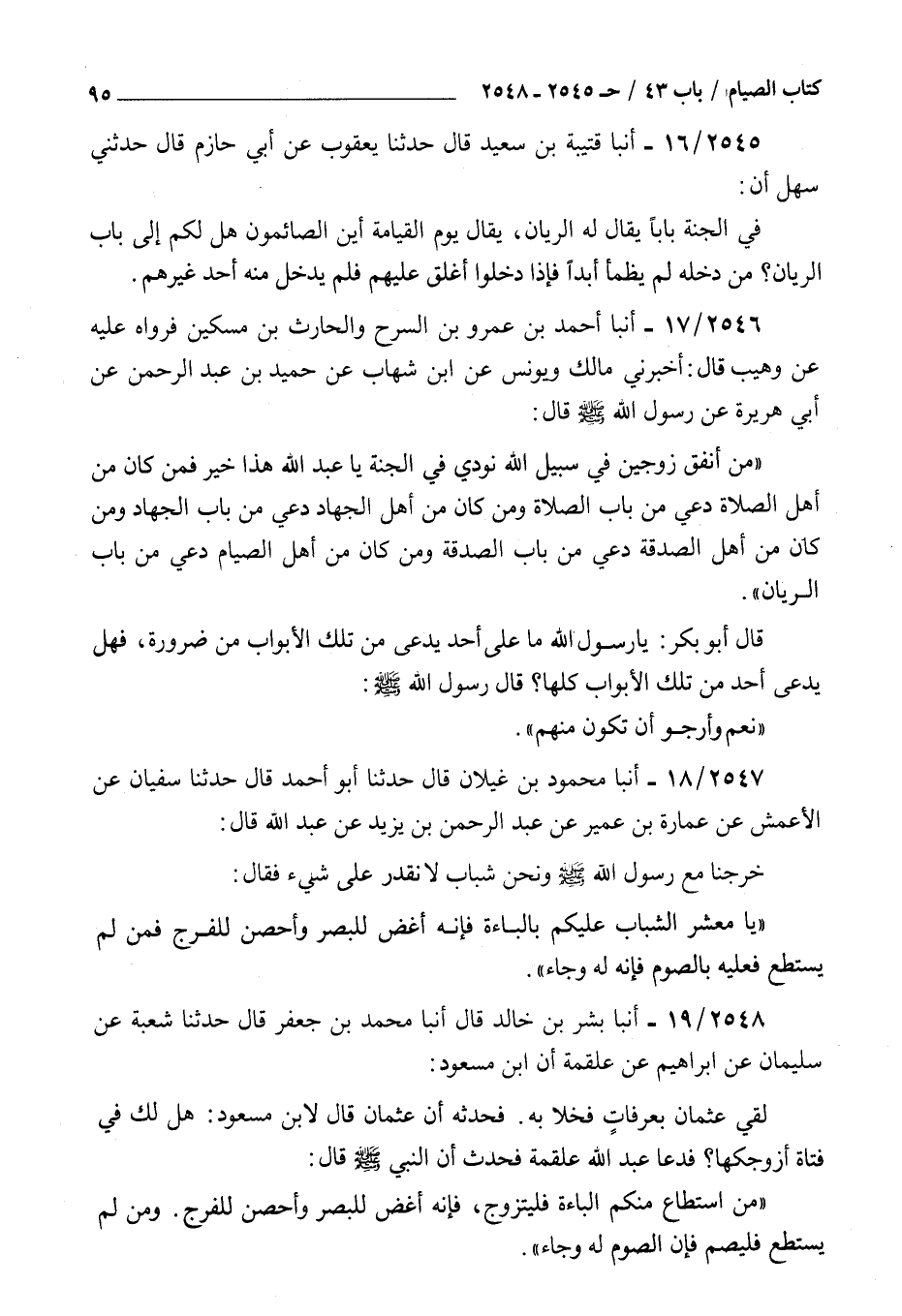 2548 - أنبأ بشر بن خالد قال أنبأ محمد بن جعفر قال حدثنا شعبة عن سليمان عن إبراهيم عن علقمة أن بن مسعود لقي عثمان بعرفات فخلا به فحدثه أن عثمان قال لابن مسعود هل لك في فتاة أزوجكها فدعا عبد الله علقمة فحدث أن النبي صلى الله عليه و سلم قال : من استطاع منكم الباءة فليتزوج فإنه أغض للبصر وأحصن للفرج ومن لم يستطع فليصم فإن الصوم له وجاء