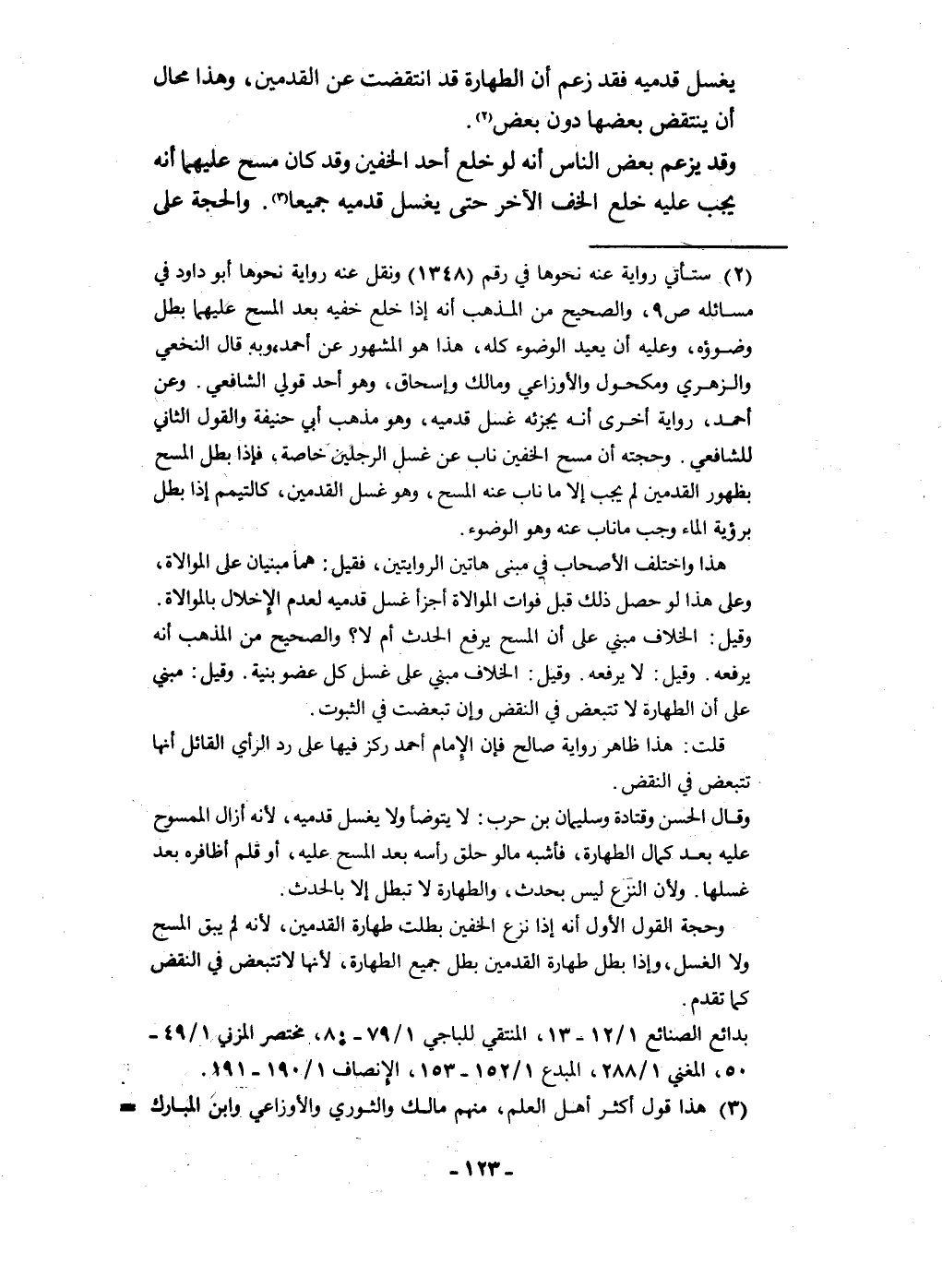 يغسل قَدَمَيْهِ فقد زعم أَن الطَّهَارَة قد انتقضت عَن الْقَدَمَيْنِ وَهَذَا محَال أَن ينْتَقض بَعْضهَا دون بعض وَقد يزْعم بعض النَّاس أَنه لَو خلع أحد الْخُفَّيْنِ وَقد كَانَ مسح عَلَيْهِمَا أَنه يجب عَلَيْهِ خلع الْخُف الآخر حَتَّى يغسل قَدَمَيْهِ جَمِيعًا وَالْحجّة على