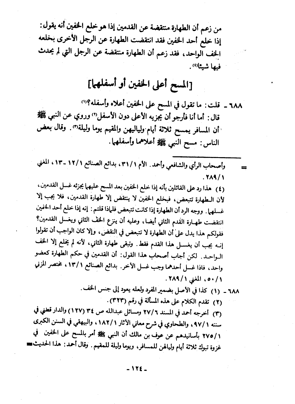 ٦٨٨ - قلت مَا تَقول فِي الْمسْح على الْخُفَّيْنِ أَعْلَاهُ وأسفله قَالَ أما أَنا فأرجو أَن يجْزِيه الْأَعْلَى دون الْأَسْفَل وَرُوِيَ عَن النَّبِي صلى الله عَلَيْهِ وَسلم أَن الْمُسَافِر يمسح ثَلَاثَة أَيَّام ولياليهن والمقيم يَوْمًا وَلَيْلَة وَقَالَ بعض النَّاس مسح النَّبِي صلى الله عَلَيْهِ وَسلم أعلاهما وأسفلهما