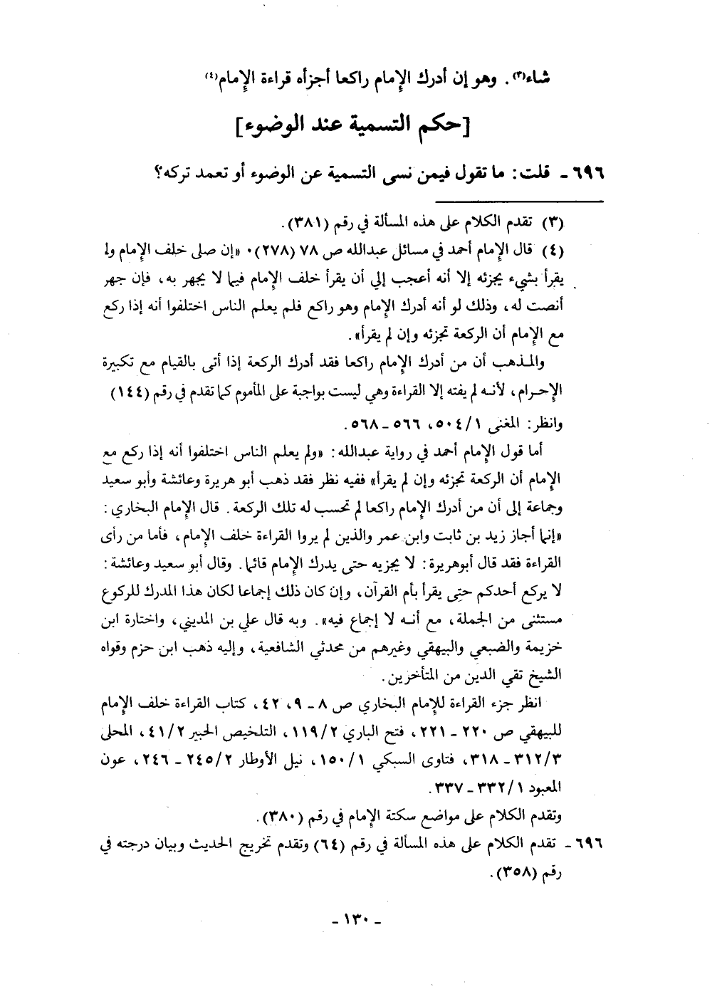 ٦٩٦ - قلت مَا تَقول فِيمَن نسي التَّسْمِيَة عَن الْوضُوء أَو تعمد تَركه