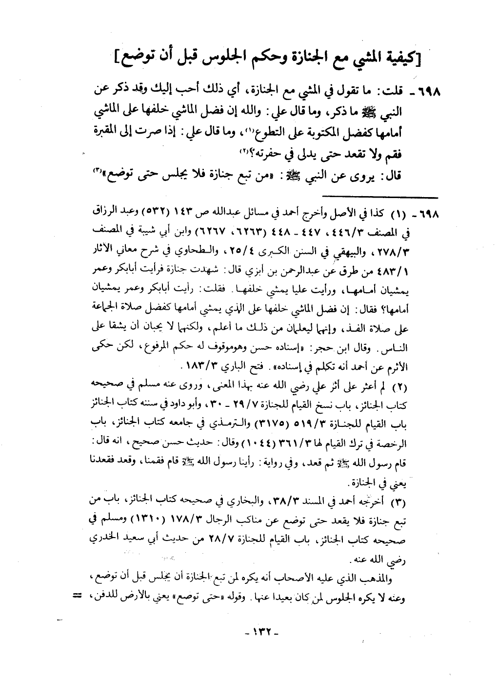 ٦٩٨ - قلت مَا تَقول فِي الْمَشْي مَعَ الْجِنَازَة أَي ذَلِك أحب إِلَيْك وَقد ذكر عَن النَّبِي صلى الله عَلَيْهِ وَسلم مَا ذكر وَمَا قَالَ عَليّ وَالله إِن فضل الْمَاشِي خلفهَا على الْمَاشِي أمامها كفضل الْمَكْتُوبَة على التَّطَوُّع وَمَا قَالَ عَليّ إِذا صرت إِلَى الْمقْبرَة فَقُمْ وَلَا تقعد حَتَّى يدلى فِي حفرته قَالَ يرْوى عَن النَّبِي صلى الله عَلَيْهِ وَسلم من تبع جَنَازَة فَلَا يجلس حَتَّى تُوضَع