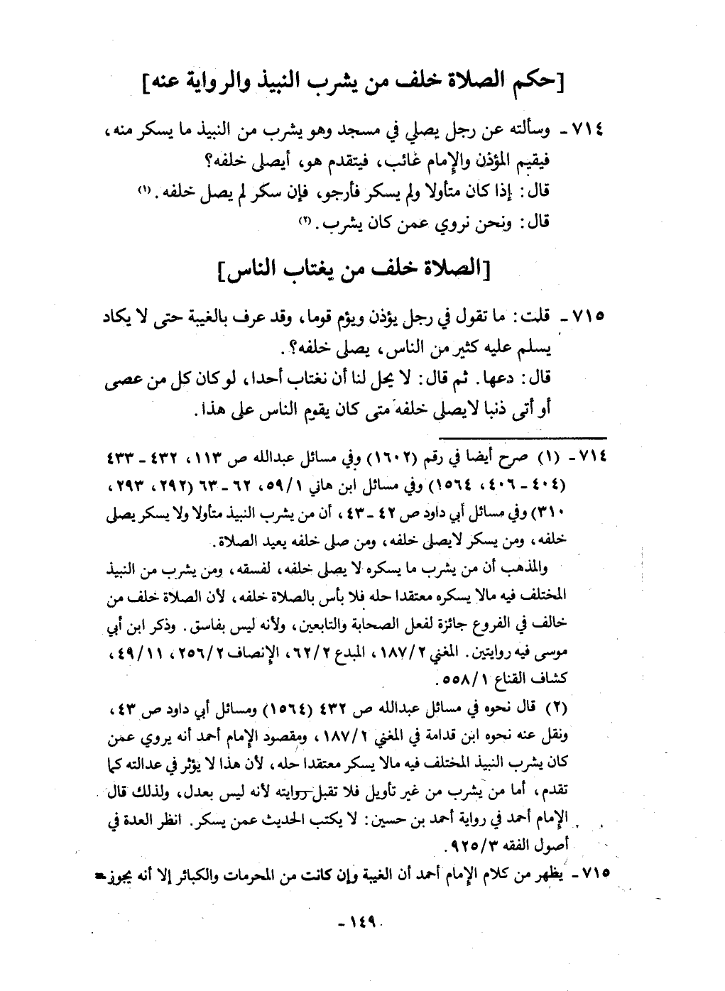 ٧١٥ - قلت مَا تَقول فِي رجل يُؤذن ويؤم قوما وَقد عرف بالغيبة حَتَّى لَا يكَاد يسلم عَلَيْهِ كثير من النَّاس يصلى خَلفه قَالَ دعها ثمَّ قَالَ لَا يحل لنا أَن نغتاب أحدا لَو كَانَ كل من عصى أَو أَتَى ذَنبا لَا يصلى خَلفه مَتى كَانَ يقوم النَّاس على هَذَا