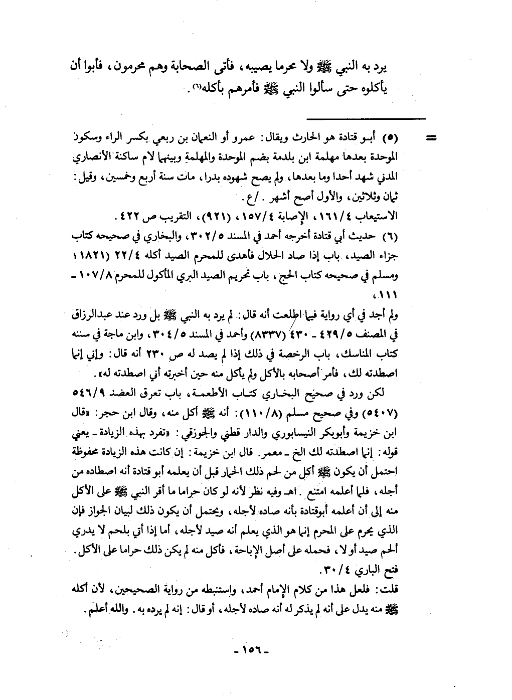 يرد بِهِ النَّبِي صلى الله عَلَيْهِ وَسلم وَلَا محرما يُصِيبهُ فَأتى الصَّحَابَة وهم محرمون فَأَبَوا أَن يأكلوه حَتَّى سَأَلُوا النَّبِي صلى الله عَلَيْهِ وَسلم فَأَمرهمْ بِأَكْلِهِ