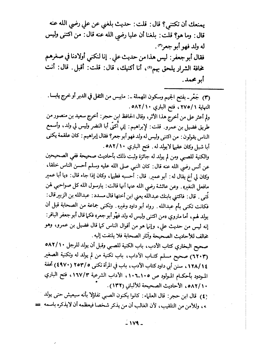 يمنعك أَن تكتني قَالَ قلت حَدِيث بَلغنِي عَن عَليّ رَضِي الله عَنهُ قَالَ وَمَا هُوَ قلت بلغنَا أَن عليا رَضِي الله عَنهُ قَالَ من اكتنى وَلَيْسَ لَهُ ولد فَهُوَ أَبُو جعر فَقَالَ أَبُو جَعْفَر لَيْسَ هَذَا من حَدِيث عَليّ إِنَّا لنكني أَوْلَادنَا فِي صغرهم مَخَافَة الشرار يلْحق بهم أَنا أكنيك قَالَ قلت أقبل قَالَ أَنْت أَبُو مُحَمَّد