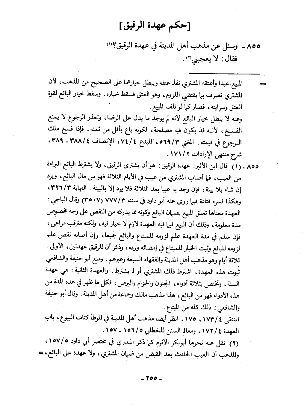 ٨٥٥ - وَسُئِلَ عَن مَذْهَب أهل الْمَدِينَة فِي عُهْدَة الرَّقِيق فَقَالَ لَا يُعجبنِي