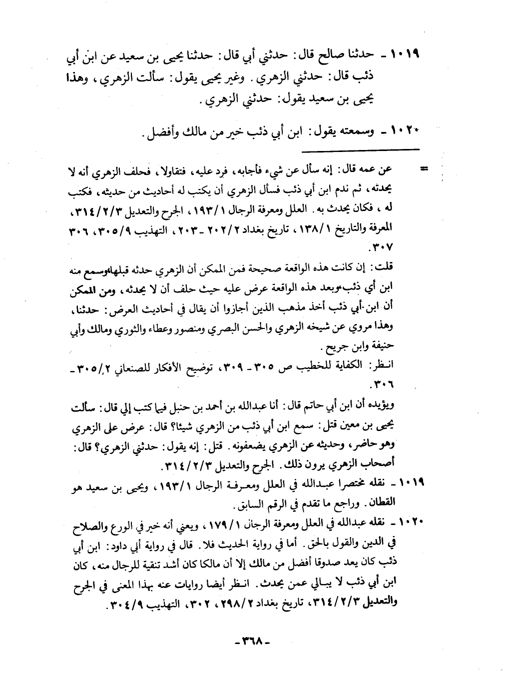 ١٠٢٠ - وسمعته يَقُول ابْن أبي ذِئْب خير من مَالك وَأفضل