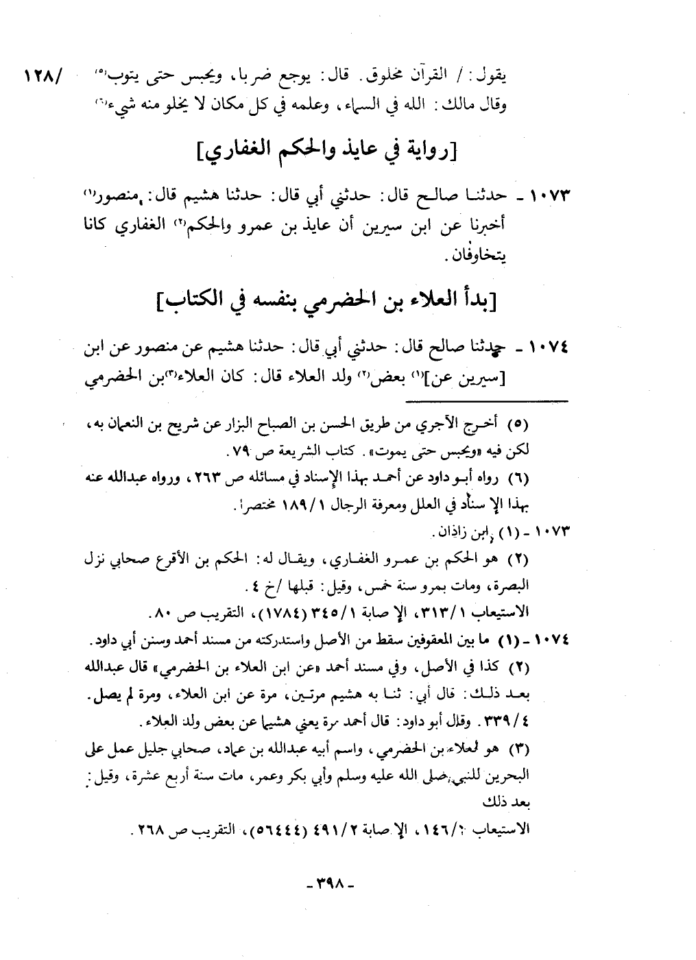 ١٠٧٤ - حَدثنَا صَالح قَالَ حَدثنِي أبي قَالَ حَدثنَا هشيم عَن مَنْصُور عَن ابْن سِيرِين عَن بعض ولد الْعَلَاء قَالَ كَانَ الْعَلَاء بن الْحَضْرَمِيّ