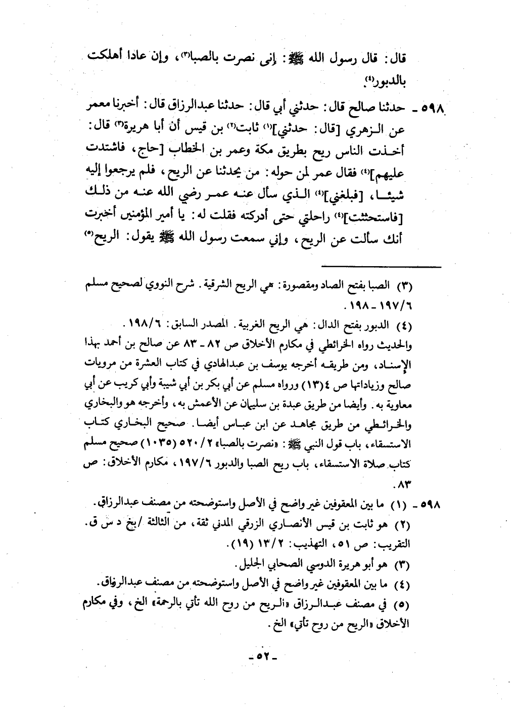 ٥٩٨ - حَدثنَا صَالح قَالَ حَدثنِي أبي قَالَ حَدثنَا عبد الرَّزَّاق قَالَ أخبرنَا معمر عَن الزُّهْرِيّ قَالَ حَدثنِي ثَابت بن قيس أَن أَبَا هُرَيْرَة قَالَ أخذت النَّاس ريح بطرِيق مَكَّة وَعمر بن الْخطاب حَاج فاشتدت عَلَيْهِم فَقَالَ عمر لمن حوله من يحدثنا عَن الرّيح فَلم يرجِعوا إِلَيْهِ شَيْئا فبلغني الَّذِي سَأَلَ عَنهُ عمر رَضِي الله عَنهُ من ذَلِك فاستحثثت رَاحِلَتي حَتَّى أَدْرَكته فَقلت لَهُ يَا أَمِير الْمُؤمنِينَ أخْبرت أَنَّك سَأَلت عَن الرّيح وَإِنِّي سَمِعت رَسُول الله صلى الله عَلَيْهِ وَسلم يَقُول الرّيح