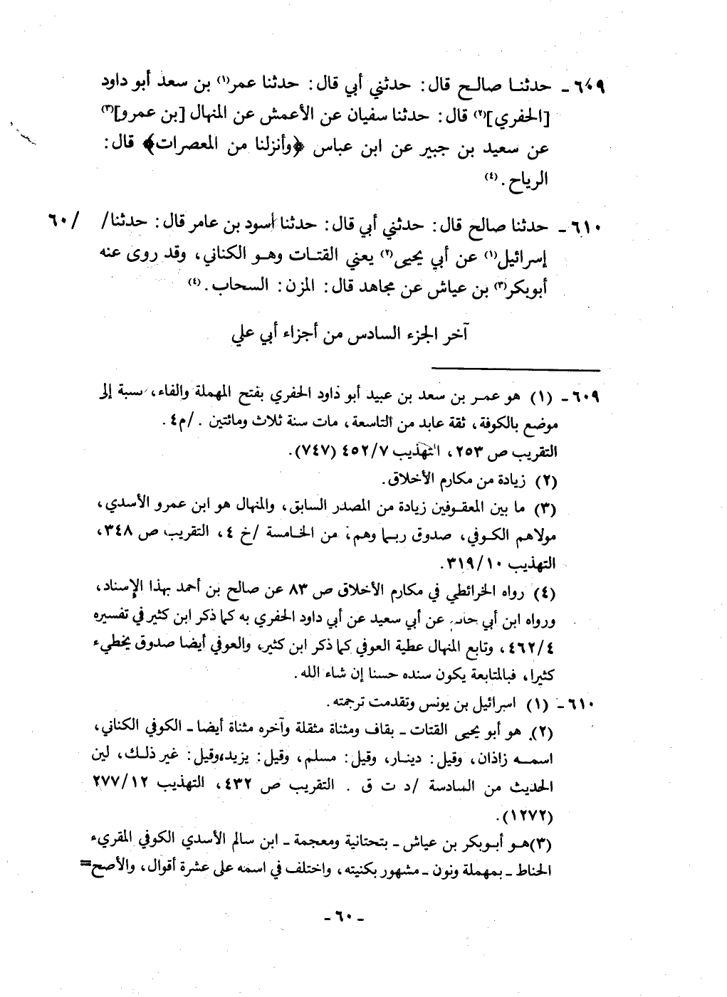 ٦١٠ - حَدثنَا صَالح قَالَ حَدثنِي أبي قَالَ حَدثنَا أسود بن عَامر قَالَ حَدثنَا إِسْرَائِيل عَن أبي يحيى يَعْنِي القَتَّات وَهُوَ الْكِنَانِي وَقد روى عَنهُ أَبُو بكر بن عَيَّاش عَن مُجَاهِد قَالَ المزن السَّحَاب آخر الْجُزْء السَّادِس من أَجزَاء أبي عَليّ