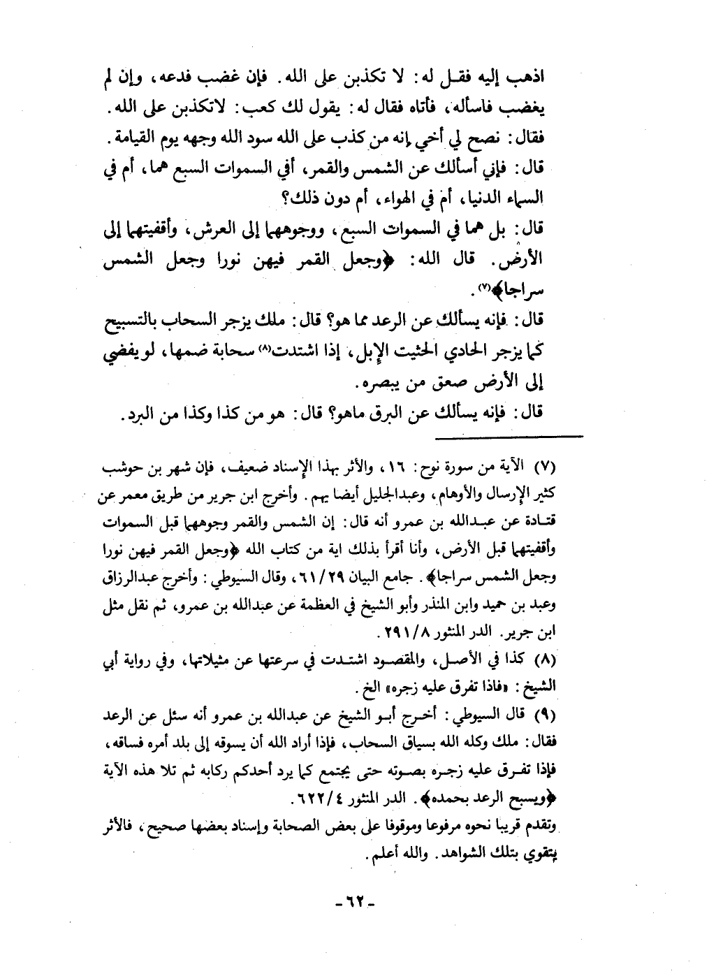 اذْهَبْ إِلَيْهِ فَقل لَهُ لَا تكذبن على الله فَإِن غضب فَدَعْهُ وَإِن لم يغْضب فَاسْأَلْهُ فَأَتَاهُ فَقَالَ لَهُ يَقُول لَك كَعْب لَا تكذبن على الله فَقَالَ نصح لي أخي إِنَّه من كذب على الله سود الله وَجهه يَوْم الْقِيَامَة قَالَ فَإِنِّي أَسأَلك عَن الشَّمْس وَالْقَمَر أَفِي السَّمَوَات السَّبع هما أم فِي السَّمَاء الدُّنْيَا أم فِي الْهَوَاء أم دون ذَلِك قَالَ بل هم فِي السَّمَوَات السَّبع ووجوههما إِلَى الْعَرْش وَأَقْفِيَتهمَا إِلَى الأَرْض قَالَ الله {وَجعل الْقَمَر فِيهِنَّ نورا وَجعل الشَّمْس سِرَاجًا} قَالَ فَإِنَّهُ يَسْأَلك عَن الرَّعْد مِمَّا هُوَ قَالَ ملك يزْجر السَّحَاب بالتسبيح كَمَا يزْجر الْحَادِي الحثيت الْإِبِل إِذا اشتدت سَحَابَة ضمهَا لَو يُفْضِي إِلَى الأَرْض صعق من يبصره قَالَ فَإِنَّهُ يَسْأَلك عَن الْبَرْق مَا هُوَ قَالَ هُوَ من كَذَا وَكَذَا من الْبرد