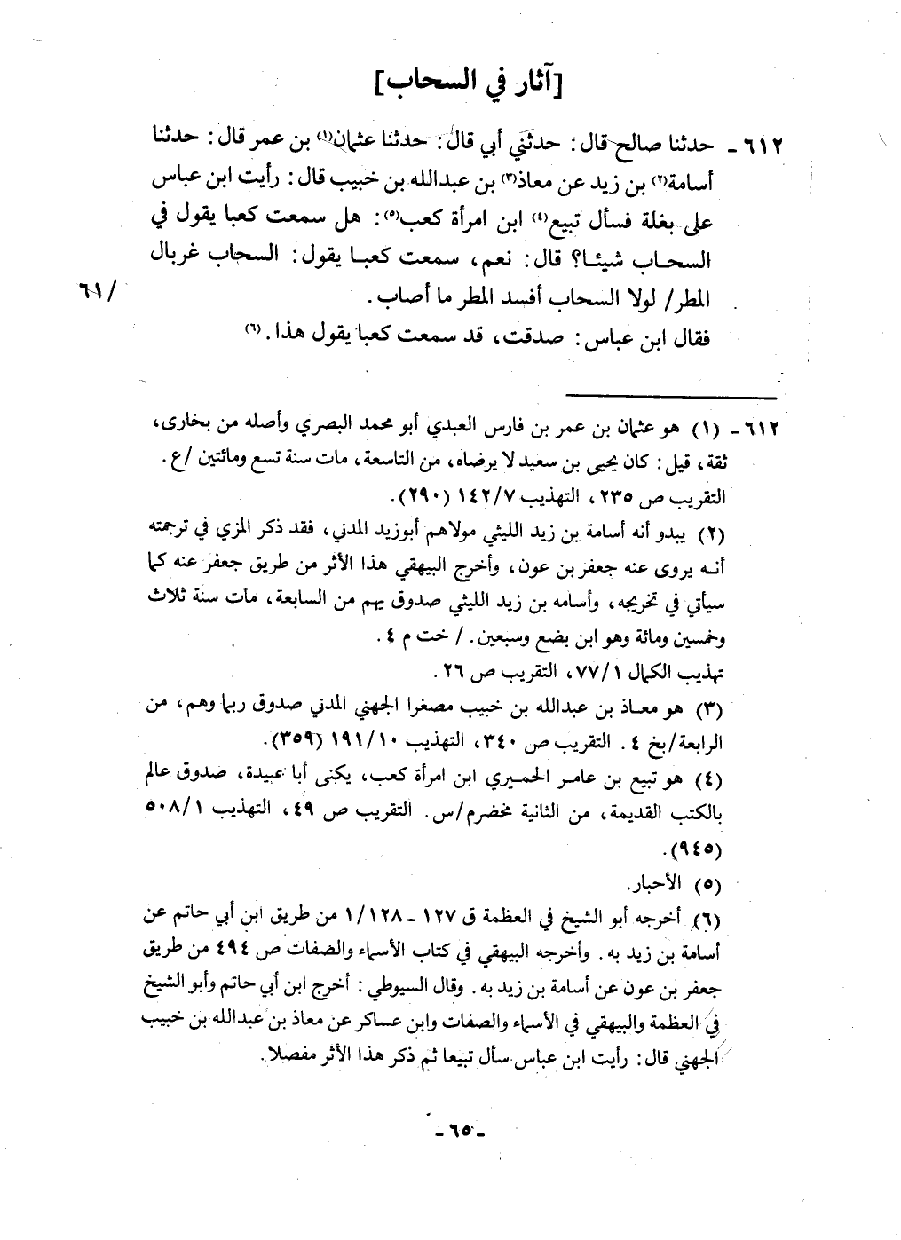 ٦١٢ - حَدثنَا صَالح قَالَ حَدثنِي أبي قَالَ حَدثنَا عُثْمَان بن عمر قَالَ حَدثنَا أُسَامَة بن زيد عَن معَاذ بن عبد الله بن خبيب قَالَ رَأَيْت ابْن عَبَّاس على بغلة فَسَأَلَ تبيع ابْن امْرَأَة كَعْب هَل سَمِعت كَعْبًا يَقُول فِي السَّحَاب شَيْئا قَالَ نعم سَمِعت كَعْبًا يَقُول السَّحَاب غربال الْمَطَر لَوْلَا السَّحَاب أفسد الْمَطَر مَا أصَاب فَقَالَ ابْن عَبَّاس صدقت قد سَمِعت كَعْبًا يَقُول هَذَا