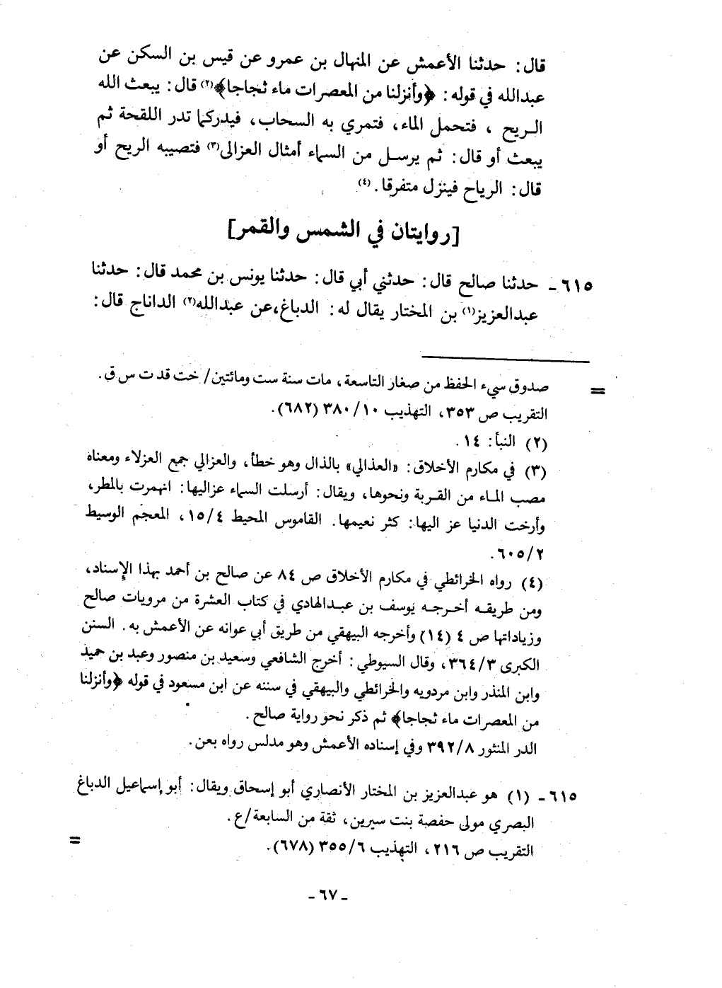 قَالَ حَدثنَا الْأَعْمَش عَن الْمنْهَال بن عَمْرو عَن قيس بن السكن عَن عبد الله فِي قَوْله {وأنزلنا من المعصرات مَاء ثجاجا} قَالَ يبْعَث الله الرّيح فَتحمل المَاء فتمري بِهِ السَّحَاب فيدر كَمَا تدر اللقحة ثمَّ يبْعَث أَو قَالَ ثمَّ يُرْسل من السَّمَاء أَمْثَال العزالى فتصيبه الرّيح أَو قَالَ الرِّيَاح فَينزل مُتَفَرقًا