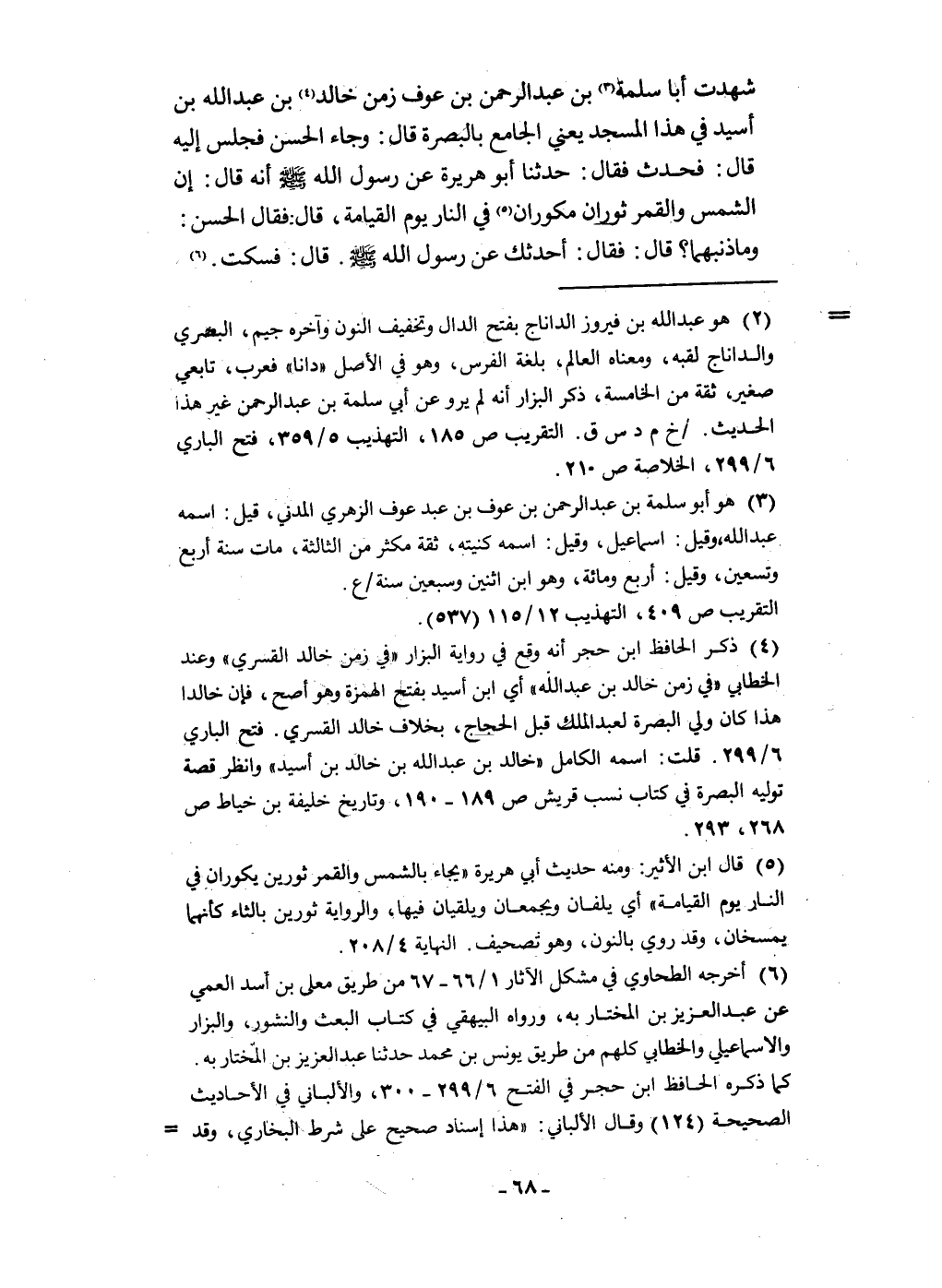 شهِدت أَبَا سَلمَة بن عبد الرَّحْمَن بن عَوْف زمن خَالِد بن عبد الله بن أسيد فِي هَذَا الْمَسْجِد يَعْنِي الْجَامِع بِالْبَصْرَةِ قَالَ وَجَاء الْحسن فَجَلَسَ إِلَيْهِ قَالَ فَحدث فَقَالَ حَدثنَا أَبُو هُرَيْرَة عَن رَسُول الله صلى الله عَلَيْهِ وَسلم أَنه قَالَ إِن الشَّمْس وَالْقَمَر ثوران مكوران فِي النَّار يَوْم الْقِيَامَة قَالَ فَقَالَ الْحسن وَمَا ذنبهما قَالَ فَقَالَ أحَدثك عَن رَسُول الله صلى الله عَلَيْهِ وَسلم قَالَ فَسكت