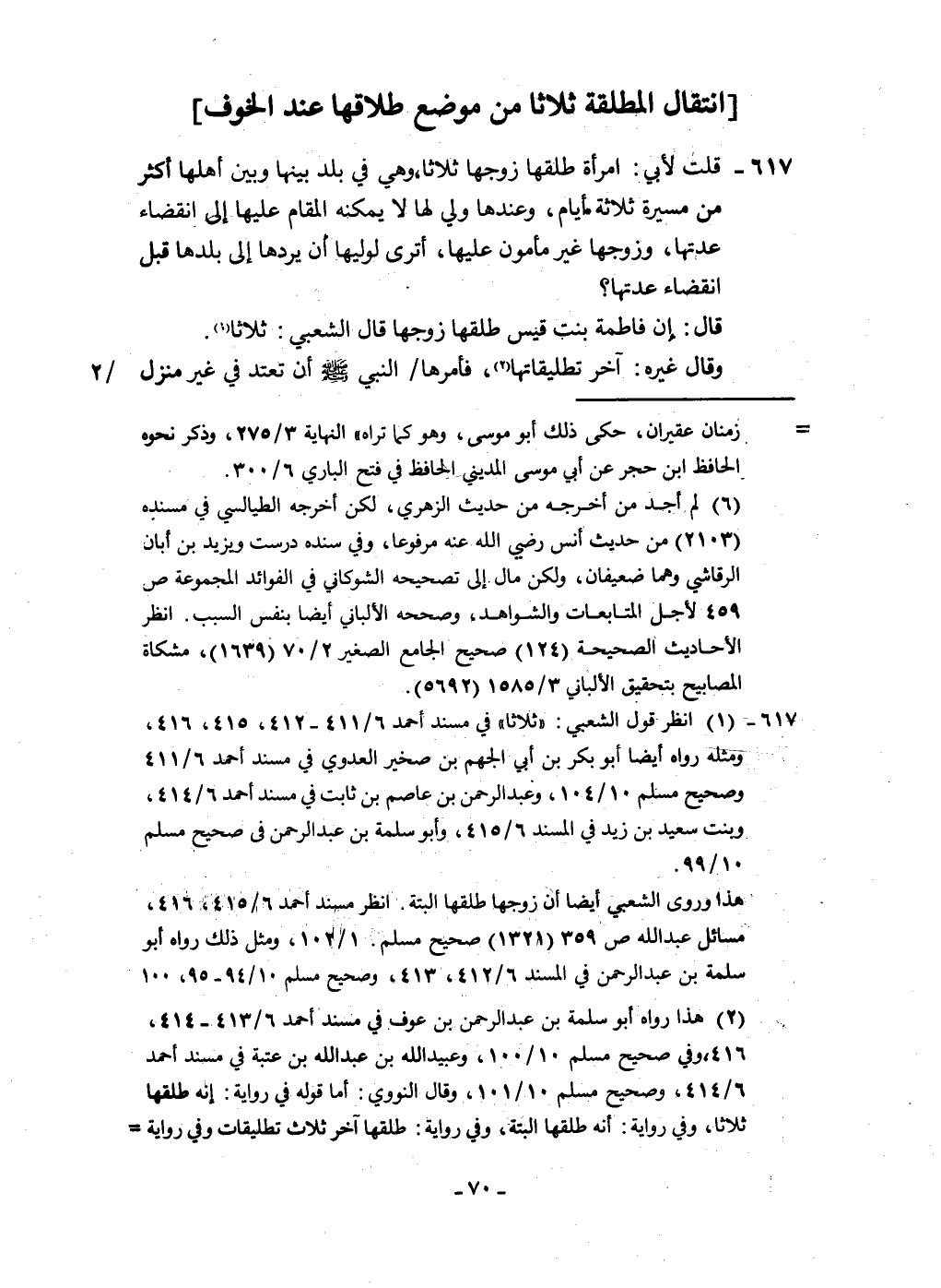 ٦١٧ - قلت لأبي امْرَأَة طَلقهَا زَوجهَا ثَلَاثًا وَهِي فِي بلد بَينهَا وَبَين أَهلهَا أَكثر من مسيرَة ثَلَاثَة أَيَّام وَعِنْدهَا ولي لَهَا لَا يُمكنهُ الْمقَام عَلَيْهَا إِلَى انْقِضَاء عدتهَا وَزوجهَا غير مَأْمُون عَلَيْهَا أَتَرَى لوَلِيّهَا أَن يردهَا إِلَى بَلَدهَا قبل انْقِضَاء عدتهَا قَالَ إِن فَاطِمَة بنت قيس طَلقهَا زَوجهَا قَالَ الشّعبِيّ ثَلَاثًا وَقَالَ غَيره آخر تطليقاتها فَأمرهَا النَّبِي صلى الله عَلَيْهِ وَسلم أَن تَعْتَد فِي غير منزل