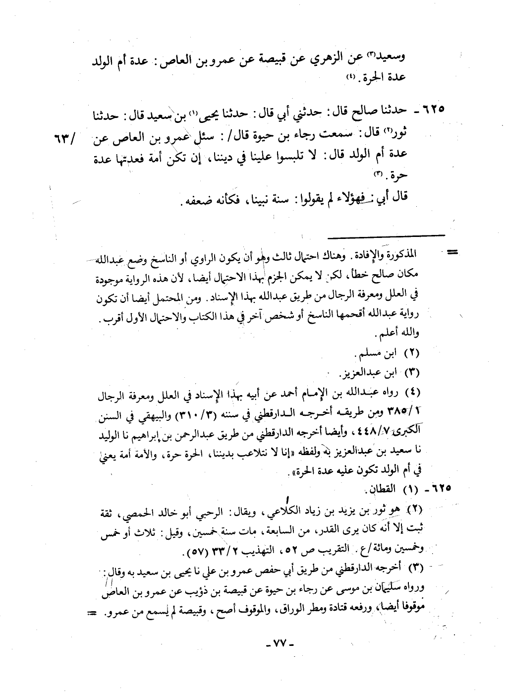 ٦٢٥ - حَدثنَا صَالح قَالَ حَدثنِي أبي قَالَ حَدثنَا يحيى بن سعيد قَالَ حَدثنَا ثَوْر قَالَ سَمِعت رَجَاء بن حَيْوَة قَالَ سُئِلَ عَمْرو بن الْعَاصِ عَن عدَّة أم الْوَلَد قَالَ لَا تلبسوا علينا فِي ديننَا إِن تكن أمة فعدتها عدَّة حرَّة قَالَ أبي فَهَؤُلَاءِ لم يَقُولُوا سنة نَبينَا فَكَأَنَّهُ ضعفه