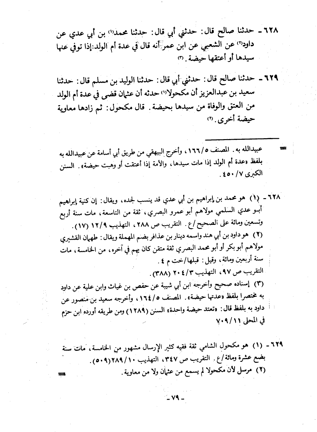 ٦٢٩ - حَدثنَا صَالح قَالَ حَدثنِي أبي قَالَ حَدثنَا الْوَلِيد بن مُسلم قَالَ حَدثنَا سعيد بن عبد الْعَزِيز أَن مَكْحُولًا حَدثهُ أَن عُثْمَان قضى فِي عدَّة أم الْوَلَد من الْعتْق والوفاة من سَيِّدهَا بِحَيْضَة قَالَ مَكْحُول ثمَّ زَادهَا مُعَاوِيَة حَيْضَة أُخْرَى
