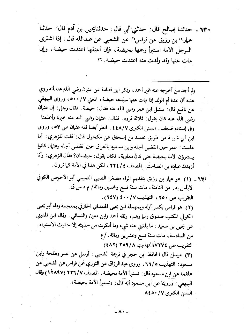 ٦٣٠ - حَدثنَا صَالح قَالَ حَدثنِي أبي قَالَ حَدثنَا يحيى بن آدم قَالَ حَدثنَا عمار بن رُزَيْق عَن فراس عَن الشّعبِيّ عَن عبد الله قَالَ إِذا أشترى الرجل الْأمة اسْتَبْرَأَ رَحمهَا بِحَيْضَة فَإِن أعْتقهَا اعْتدت حَيْضَة وَإِن مَاتَ عَنْهَا وَقد ولدت مِنْهُ اعْتدت حَيْضَة