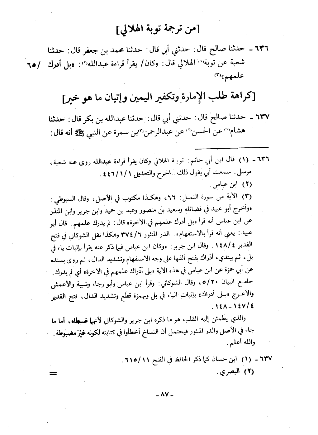 ٦٣٦ - حَدثنَا صَالح قَالَ حَدثنِي أبي قَالَ حَدثنَا مُحَمَّد بن جَعْفَر قَالَ حَدثنَا شُعْبَة عَن تَوْبَة الْهِلَالِي قَالَ وَكَانَ يقْرَأ قِرَاءَة عبد الله بل أدْرك علمهمْ