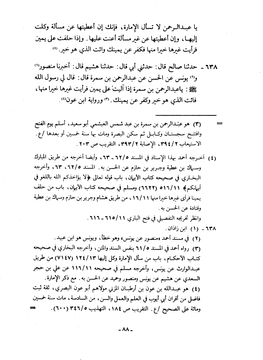 ٦٣٨ - حَدثنَا صَالح قَالَ حَدثنِي أبي قَالَ حَدثنَا هشيم قَالَ أخبرنَا مَنْصُور وَيُونُس عَن الْحسن عَن عبد الرَّحْمَن بن سَمُرَة قَالَ قَالَ لي رَسُول الله صلى الله عَلَيْهِ وَسلم يَا عبد الرَّحْمَن بن سَمُرَة إِذا آلَيْت على يَمِين فَرَأَيْت غَيرهَا خيرا مِنْهَا فَائت الَّذِي هُوَ خير وَكفر عَن يَمِينك وَرِوَايَة ابْن عون