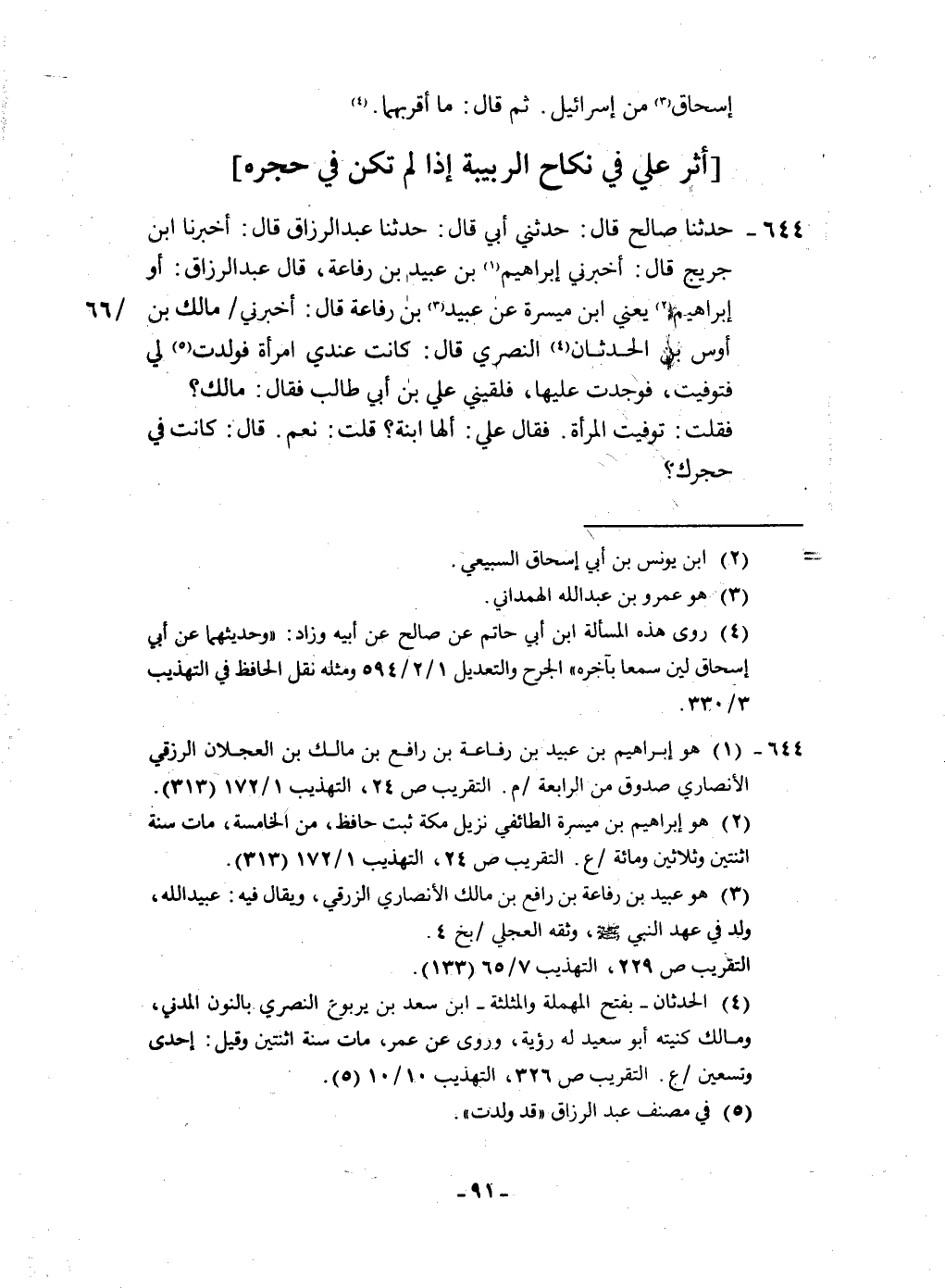 ٦٤٤ - حَدثنَا صَالح قَالَ حَدثنِي أبي قَالَ حَدثنَا عبد الرَّزَّاق قَالَ أخبرنَا ابْن جريج قَالَ أَخْبرنِي إِبْرَاهِيم بن عبيد بن رِفَاعَة قَالَ عبد الرَّزَّاق أَو إِبْرَاهِيم يَعْنِي ابْن ميسرَة عَن عبيد بن رِفَاعَة قَالَ أَخْبرنِي مَالك بن أَوْس بن الْحدثَان النصري قَالَ كَانَت عِنْدِي امْرَأَة فَولدت لي فَتُوُفِّيَتْ فَوجدت عَلَيْهَا فلقيني عَليّ بن أبي طَالب فَقَالَ مَالك فَقلت توفيت الْمَرْأَة فَقَالَ عَليّ ألها ابْنة قلت نعم قَالَ كَانَت فِي حجرك